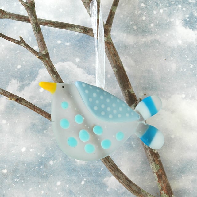 Created from layered Bullseye glass in my Whitstable workshop. This little bird has a gorgeous matt finish which gives it a wonderfully tactile feeling. The body, wing, beak and tail feathers are all hand cut and fused separately before being joined in subsequent firings with the brass hanging wire secured in place. I make adjustments until I’m satisfied with the look and the whole piece is given a final firing to achieve a perfect finish. A white organza ribbon is attached to complete the design.