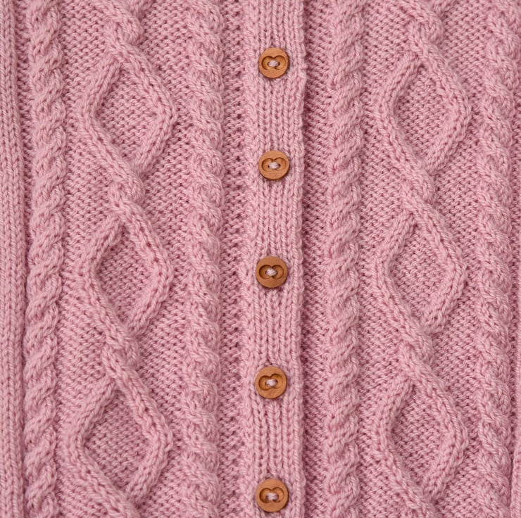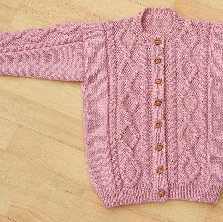 aran style cardigan hand knitted with patterned fronts and sleeves and a plain back