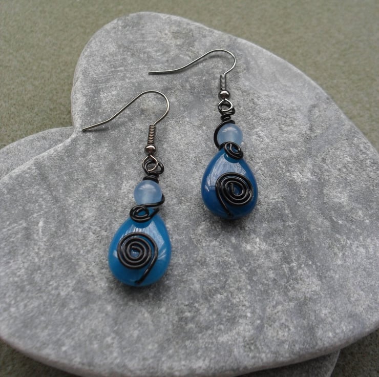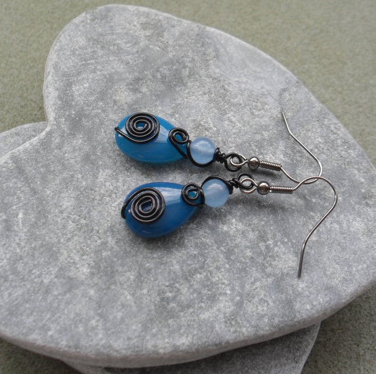 Wire wrapped earrings in blue agate,and small blue dyed quartz beads.