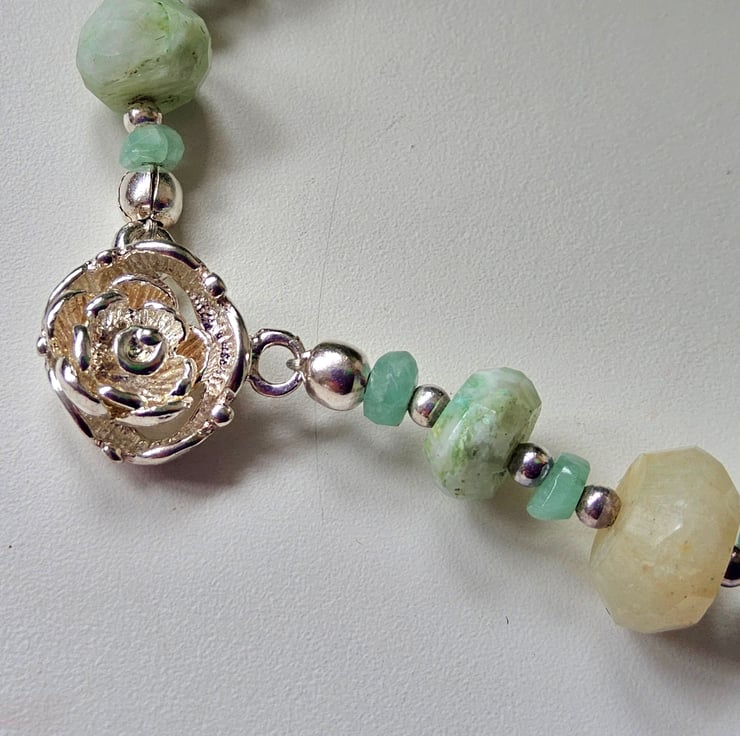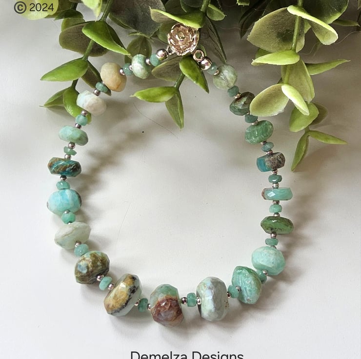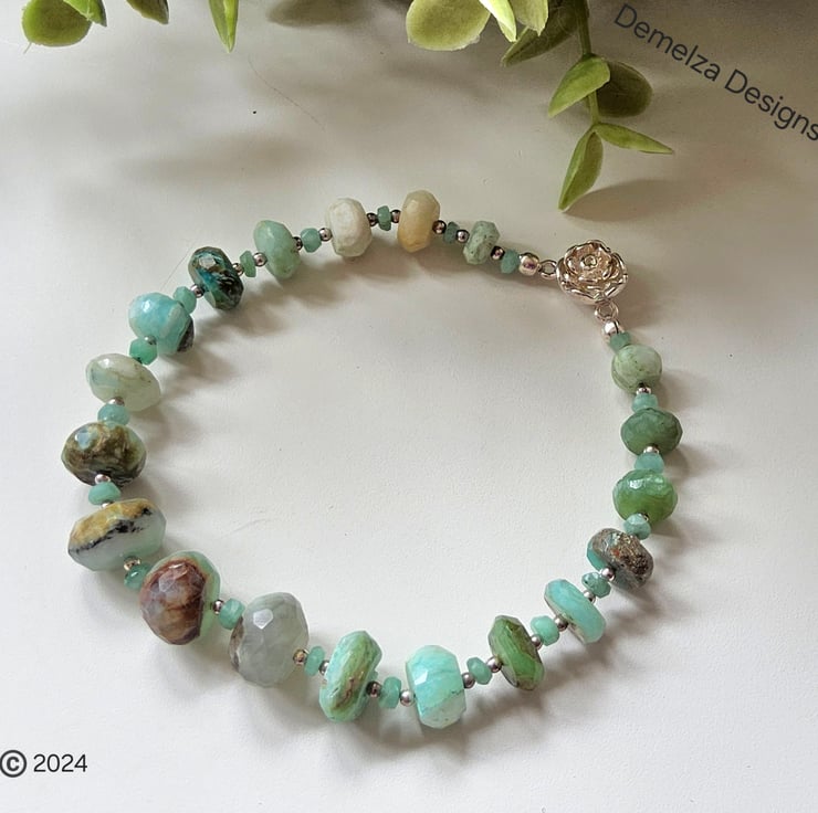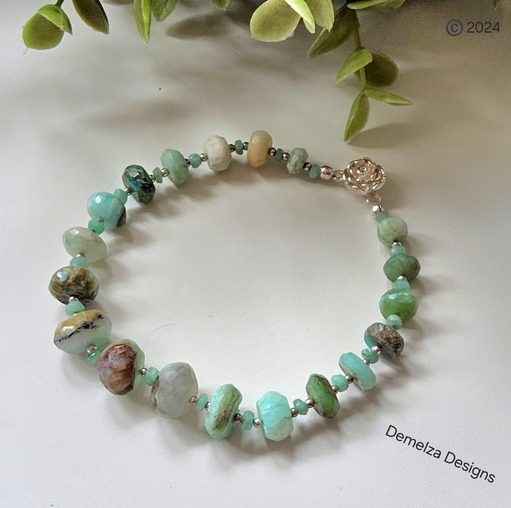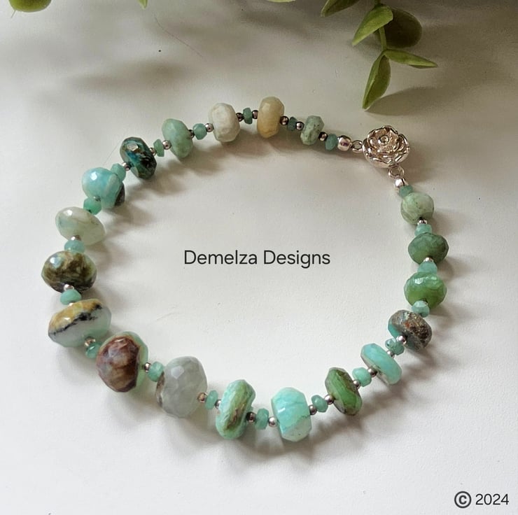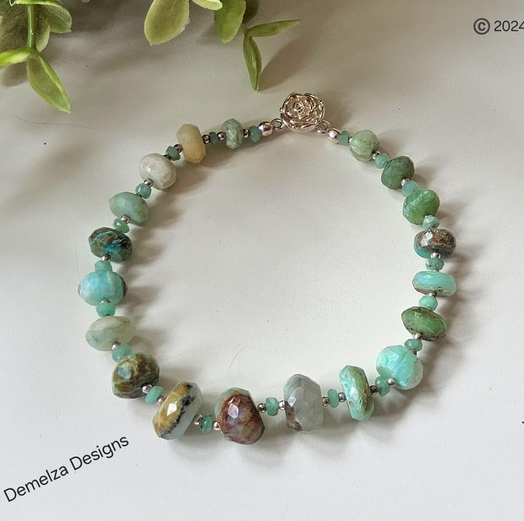 I love the organic natural look to these genuine natural untreated irregular rough cut faceted rondelle chrysoprase gemstones. They have been complimented with genuine emerald faceted roundels. Between every gemstone is a 2mm sterling silver spacer bead..