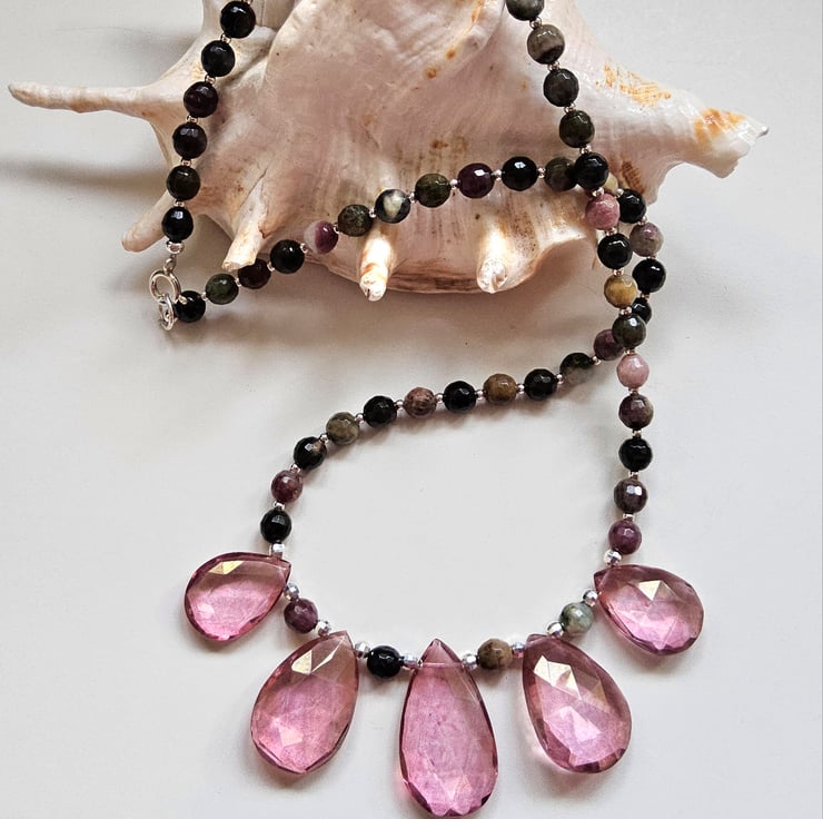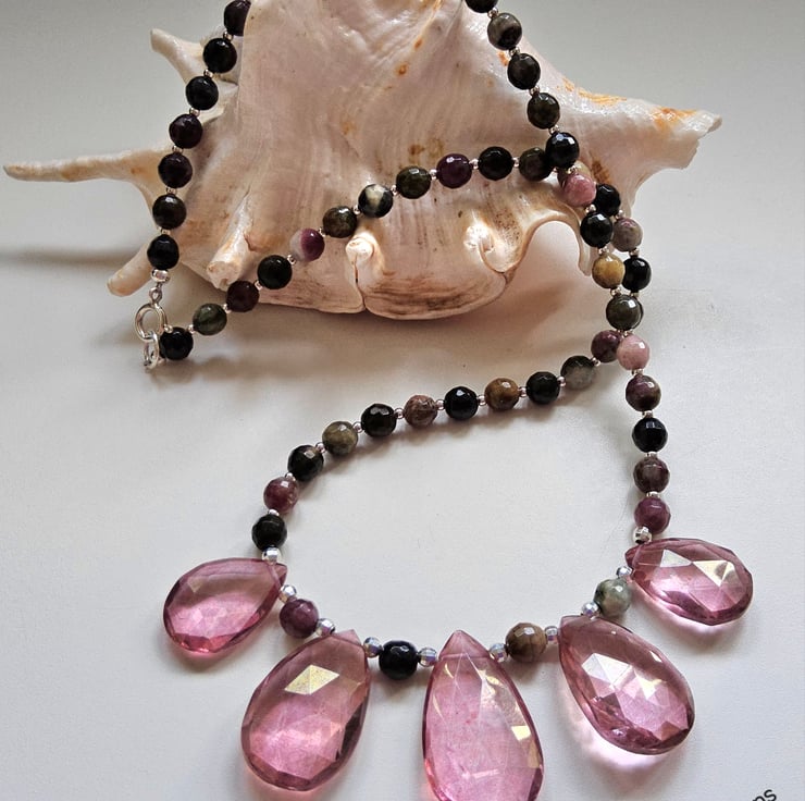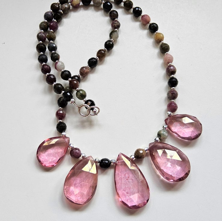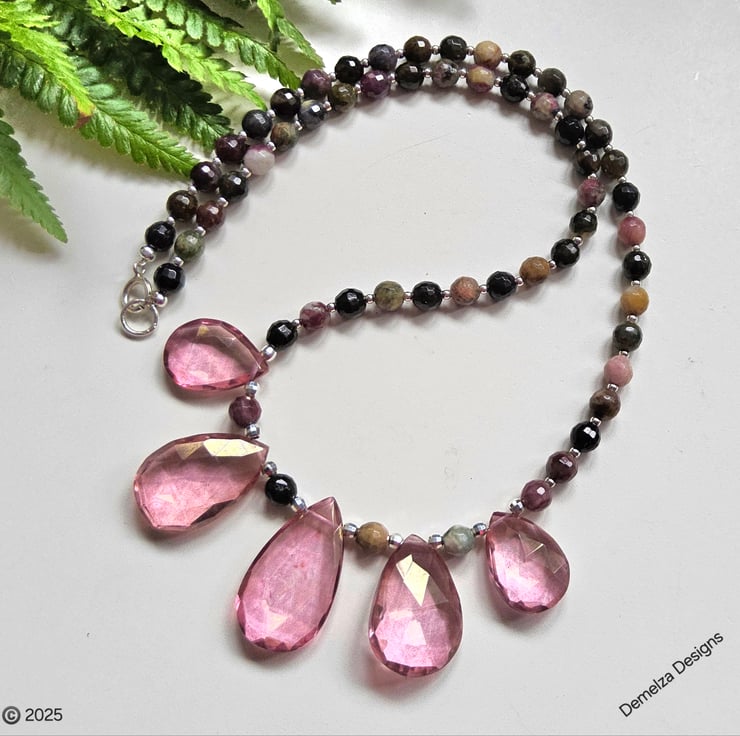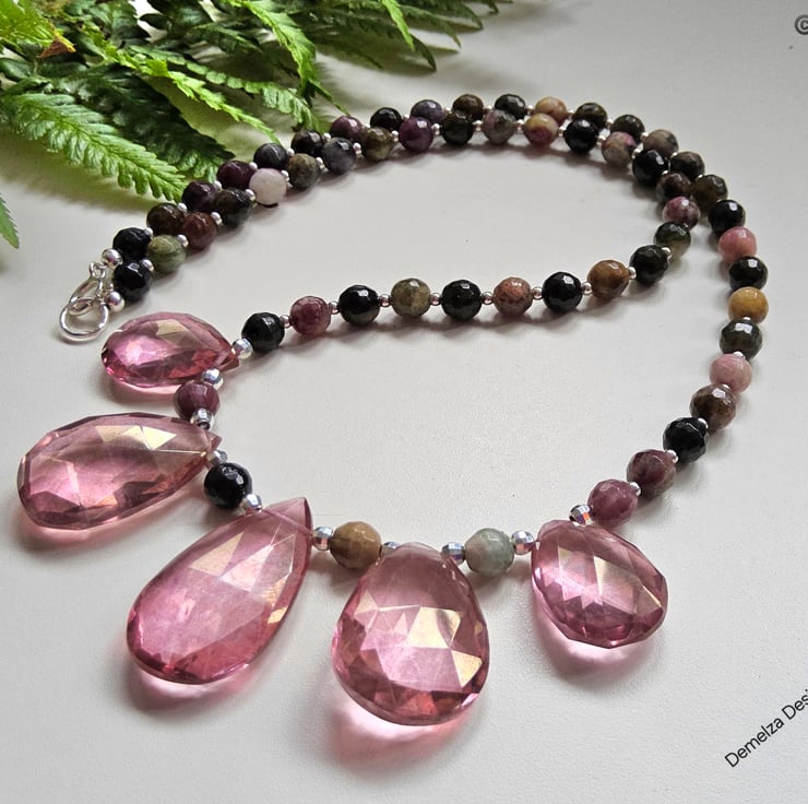 This stunning 'one off' necklace has been designed and hand crafted in Cornwall by Demelza Designs using large pink coated triangular shaped faceted quartz. To compliment them colourful natural untreated genuine faceted 6mm tournaline rounds have been used. The life long coated treatment to the quartz is a recognised process within the jewellery industry worldwide and accepted by the GIA. Between each gemstone are 2mm sterling silver spacer bead to add a luxurious look and quality finish.