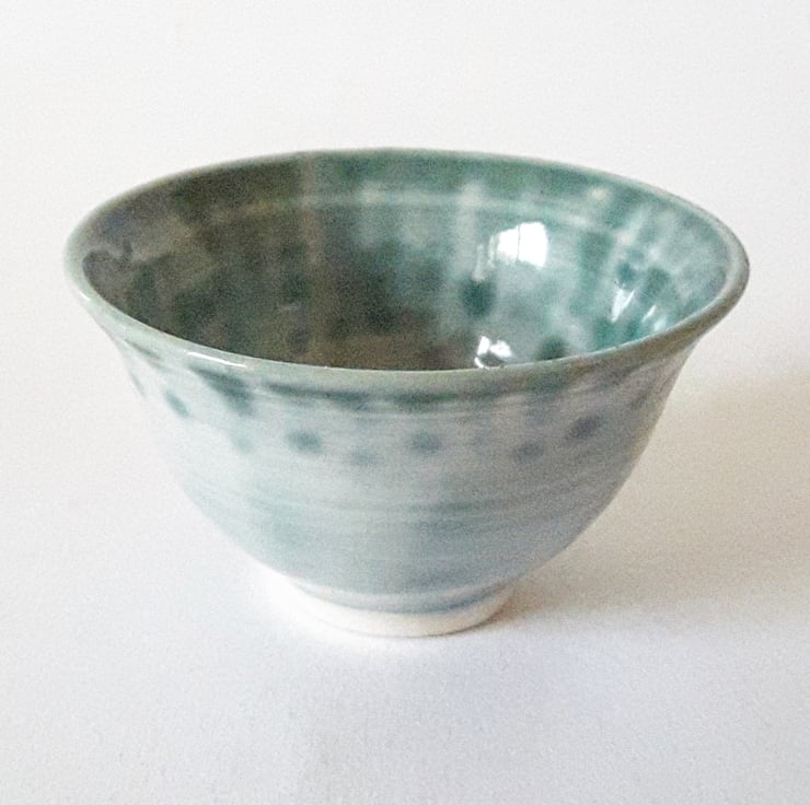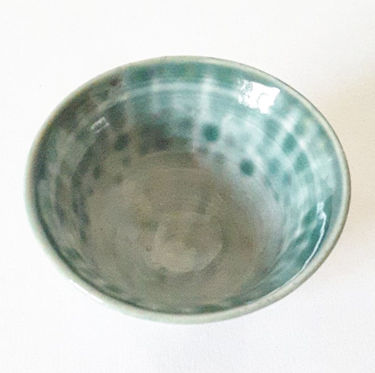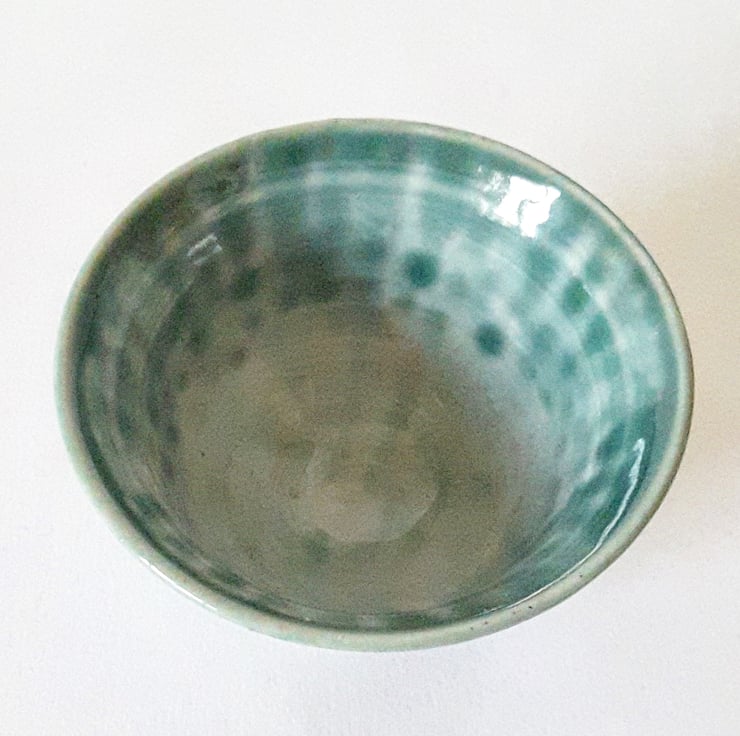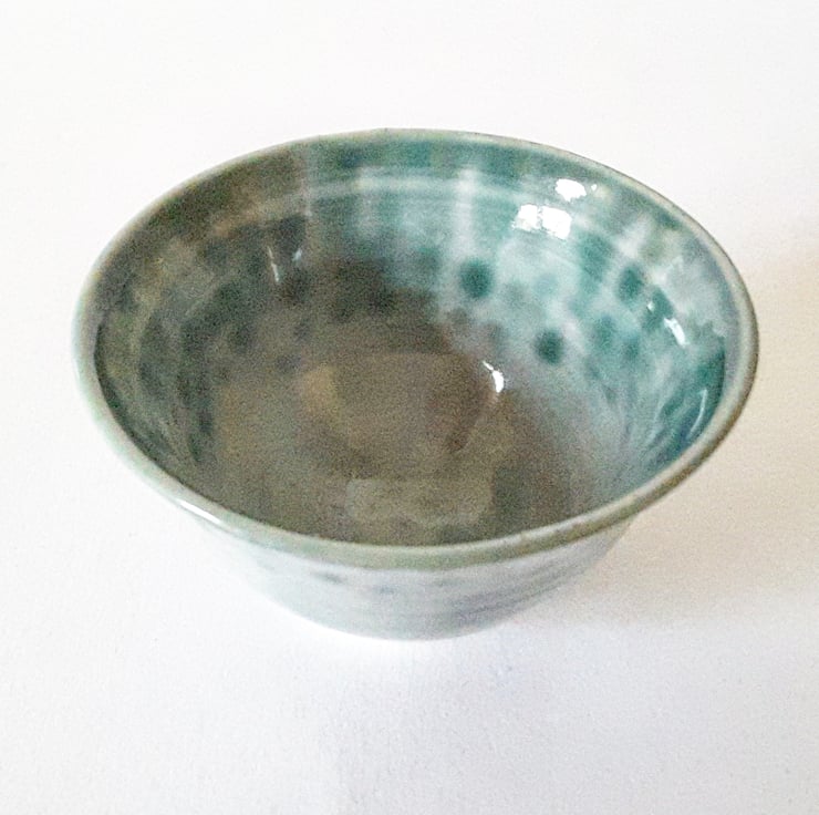 This is a handmade wheel thrown miniature ceramic bowl, made from stoneware clay and glazed in a shiny green grey glaze.