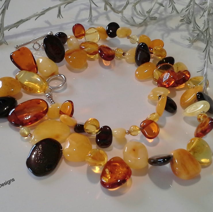 The necklace has been designed and hand crafted using quality irregular shaped Baltic Amber drops which graduate in size, complimented with Balric Amber rounds and genuine sterling silver beads.