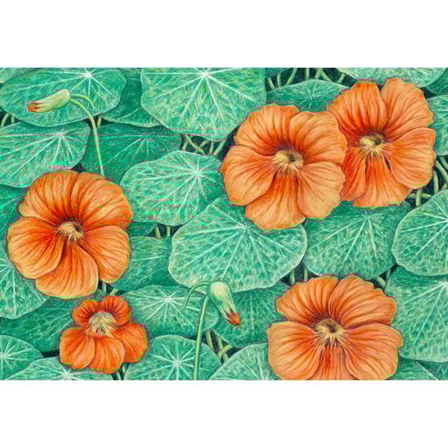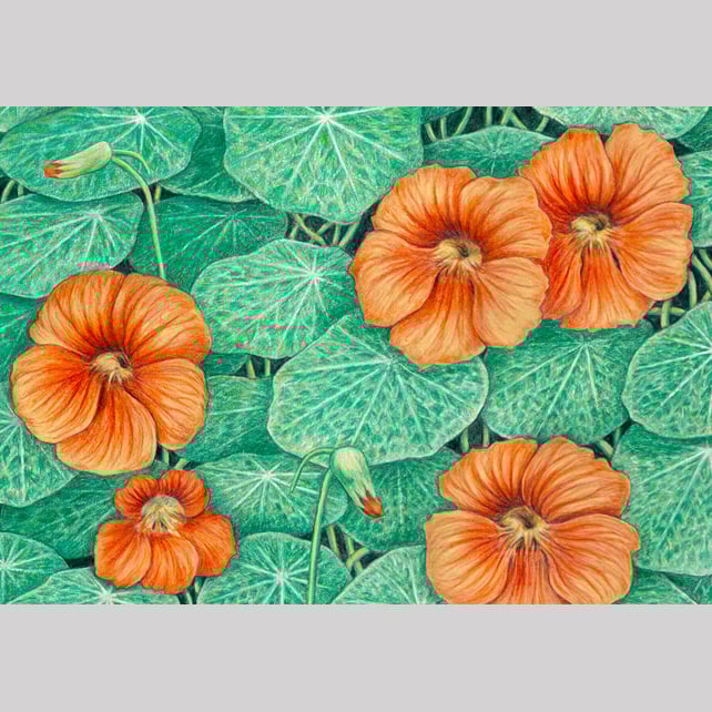 This is a unique original drawing of bright orange nasturtium flowers and buds against a mass of round green leaves veined with cream. The thin stems of the flowers and leaves fill the spaces between the leaves, shown off by a dark green background hinting at layers of greenery beneath.