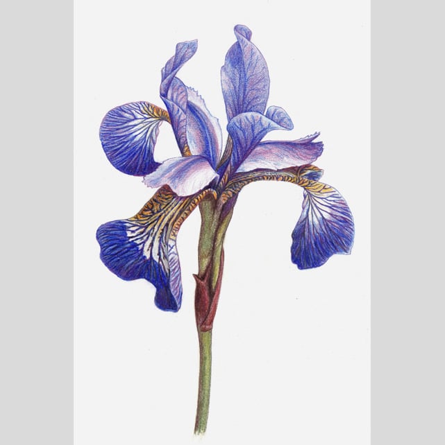 This is a unique original drawing of a single purple iris flower. The intricate shapes of the iris petals have flounces and frills, the violet tips meeting patches of white, with dark yellow at the centre, all veined in complex patterns of deepest purple. To show off this detail, a single flower stem has been isolated on a white background to enhance the colours and make an eye-catching study.