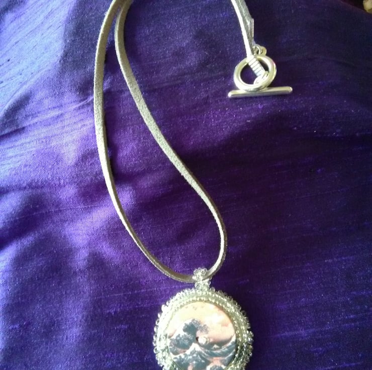 The pendant measures 4cm in diameter and the cord is 46cm long