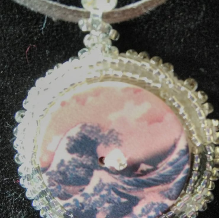 Hokusai's "Great Wave" is brought to life in this pendant featuring a central button surrounded by delicate seed bead embroidery and given a modern touch with microfibre suede thong and a toggle fastening.