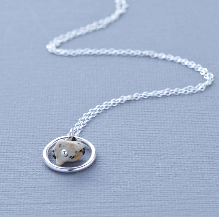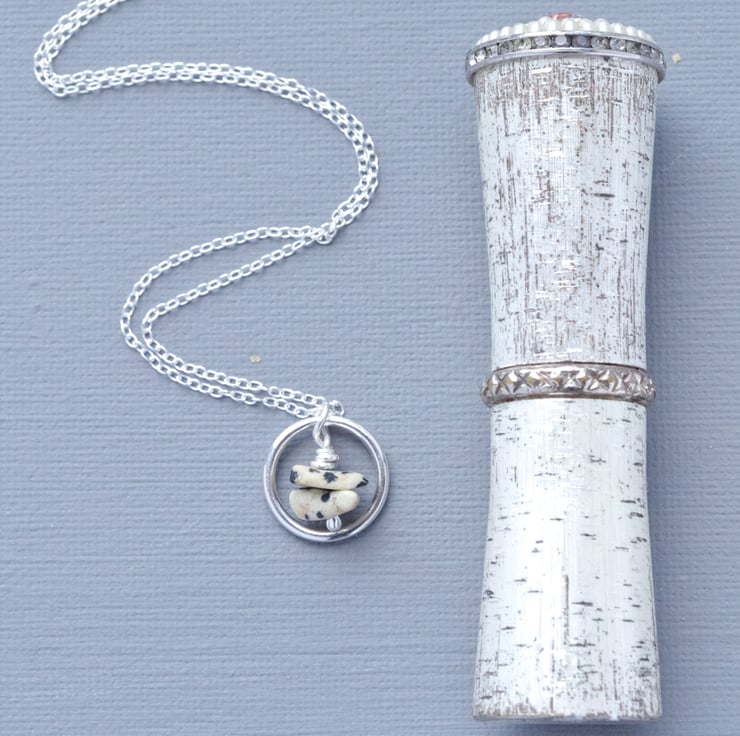 A simple and elegant Karma pendant with the added twist of natural black and white spotted Dalmatian Jasper. The hoop is a perfect circle, representing the principle of Karma, with two irregular natural jasper pebbles suspended inside. This pendant has been handmade by me using sterling silver wire, to which I have given a bright mirror finish. Dalmatian Jasper is a semi-precious gemstone, which comes in opaque creams and whites with ebony, rust and chocolate spots very similar to the markings of a Dalmatian dog or Appaloosa pony. The gemstones featured in this necklace come from an ethical source in that they have been recycled from a vintage necklace. I have ensured that all of the stones are in perfect condition in order to do this. The pendant is a very wearable size, at just 18 mm or 3/4" and is mounted on a 450 mm or 17" sterling silver trace chain stamped .925. The third photograph shows the pendant next to a 3" vintage lipstick case to show a sense of scale.