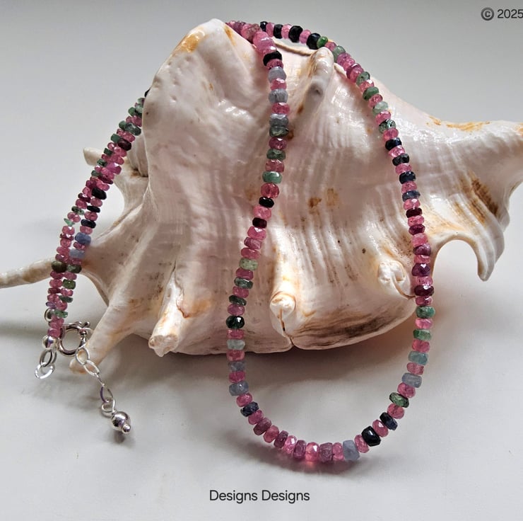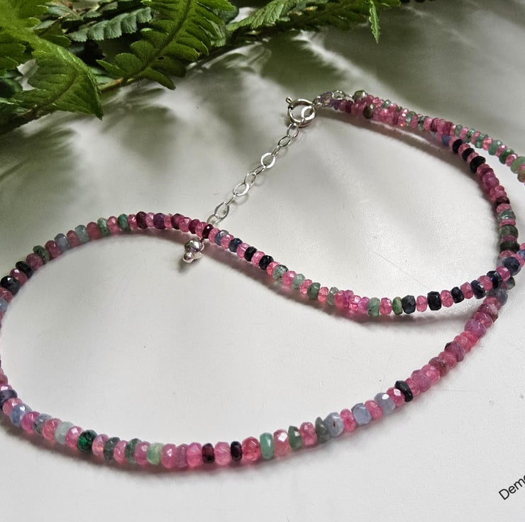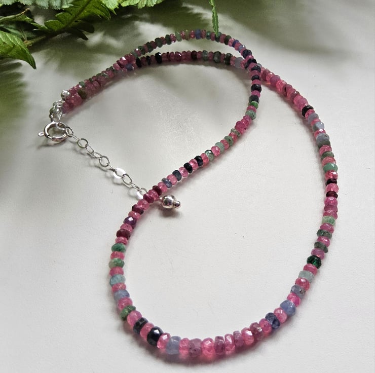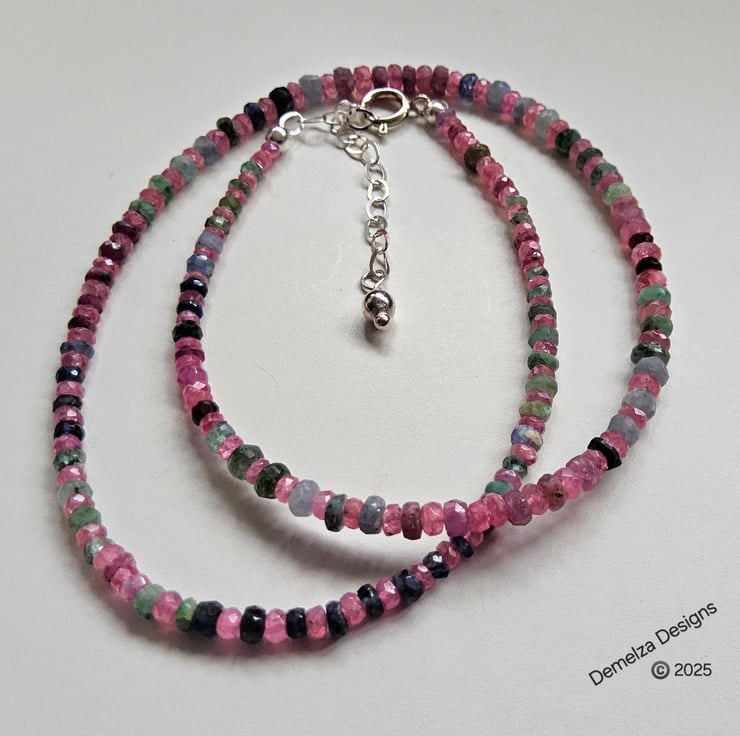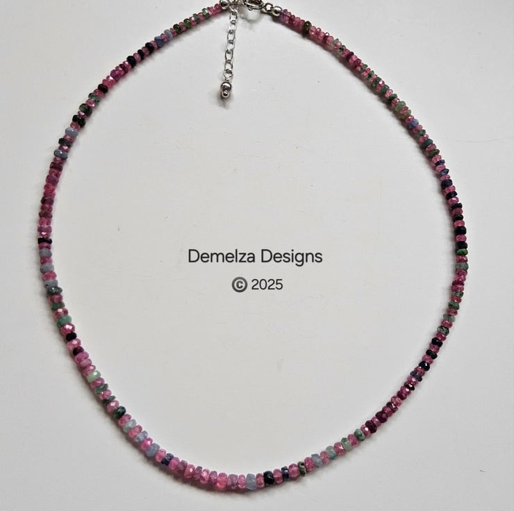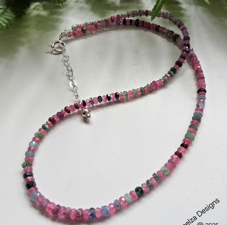 All of the genuine gemstones are facted rondelle cuts which slightly graduate in size from front to back. Between each emerald, ruby, and sapphire is a vibrant natural pink spinel making the necklace very unique and as any light source hits the pink spinels really sparkle like diamonds. The necklace has a sterling silver extender chain with a sterling silver bead attracted to the end.