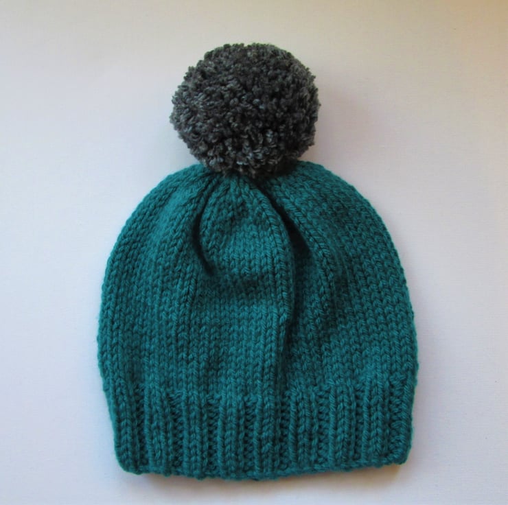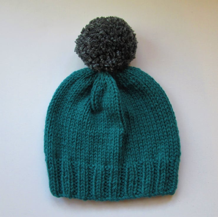This listing is for the Bobble Hat in Petrol Green Chunky Yarn with Mid Grey Pom Pom only.