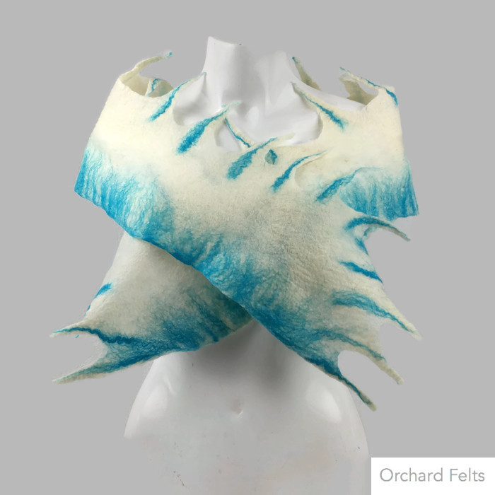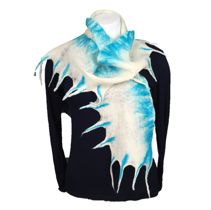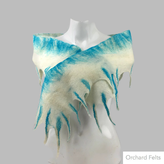 This scarf has been felted using white merino wool fibres to create a warm, soft and lightweight scarf. Along one edge, turquoise fibres have been used to create a coloured border whilst alone the opposite edge and both ends, a series of "spiky" fronds have been formed, also highlighted in a turquoise colour. Please note the turquoise fibres have been added to one side of the scarf only with the reverse left plain.
