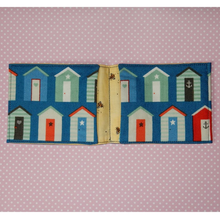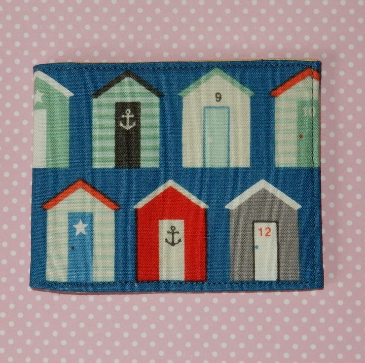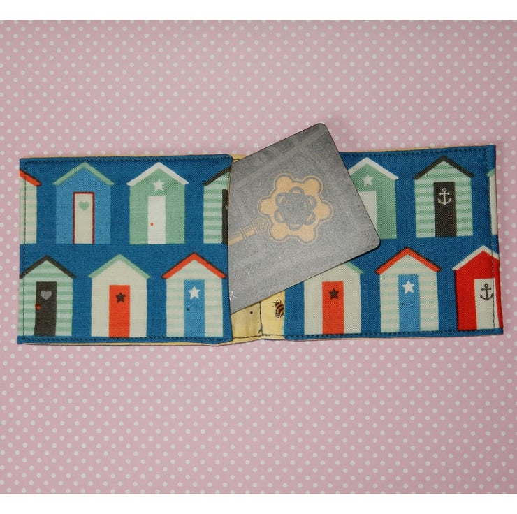 This fun beach hut themed card wallet is ideal for travel cards, Oyster cards, bus pass or even credit cards. It is made from a bright multi coloured fabric and measures approx. 3.5 x 3 inches folded and 7.5 inches open. It is lined in a toning fabric.