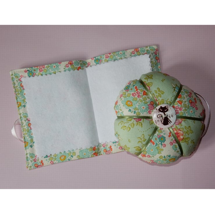 A beautiful needlecase which measures approx 4.5 x 3 inches, and a matching pincushion, they are made from two beautiful floral fabrics. The needle case is lined in the lighter cotton fabric and has four flannel leaves for your pins and needles. It is fastened with ribbon ties, which can be tied right round the case for protection in a bag. The pincushion has a ribbon trim and a toning button.