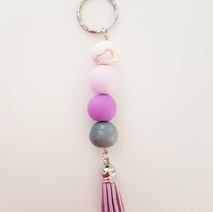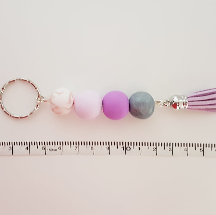 Each bead has been carefully colour mixed, then sized and added within a composition to make a complimentary completed stack. The beads are then fixed onto silver plated wire to hand, and secured onto a silver plated key chain. A complimentary coloured material tassel is added at the base to finish off the gorgeous piece.