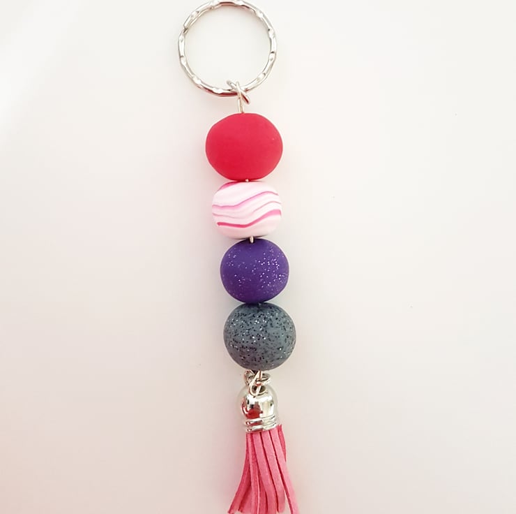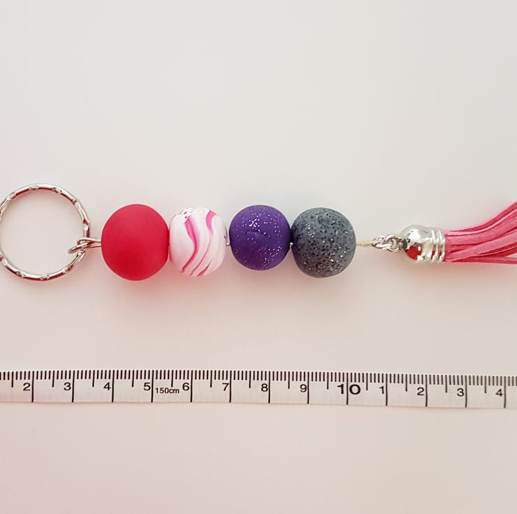 Each bead has been carefully colour mixed, then sized and added within a composition to make a complimentary completed stack. The beads are then fixed onto silver plated wire to hand, and secured onto a silver plated key chain. A complimentary coloured material tassel is added at the base to finish off the gorgeous piece.