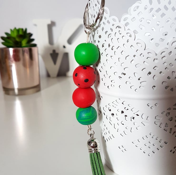 "Sugar Free" Geometric modern round beaded Keyring - Red Watermelon