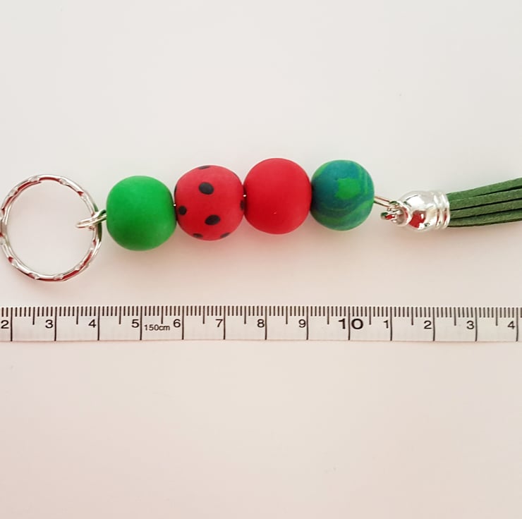 Each bead has been carefully colour mixed, then sized and added within a composition to make a complimentary completed stack. The beads are then fixed onto silver plated wire to hand, and secured onto a silver plated key chain. A complimentary coloured material tassel is added at the base to finish off the gorgeous piece.