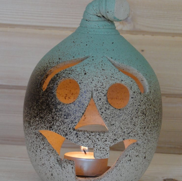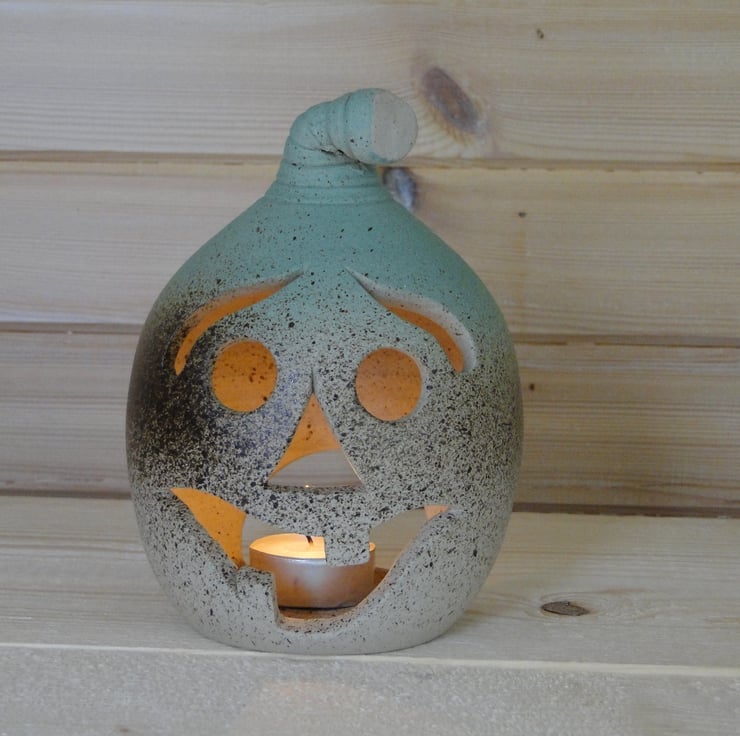 Halloween is on the way! These hand thrown and carved lanterns represent the traditional British lantern that used to be carved from swedes or turnips (depending on what part of the UK you come from) before we adopted the American version of a carved pumpkin. Each lantern has an individual expression so they have been listed separately so you can choose the one you want. It may even look like someone you know. The lantern is around 7"/17.5cm tall and has an opening in the back so you can place a nightlight candle inside. Caution: This product will get hot when the candle is in use.