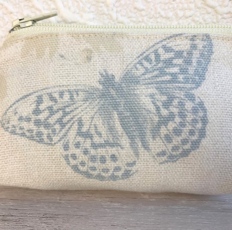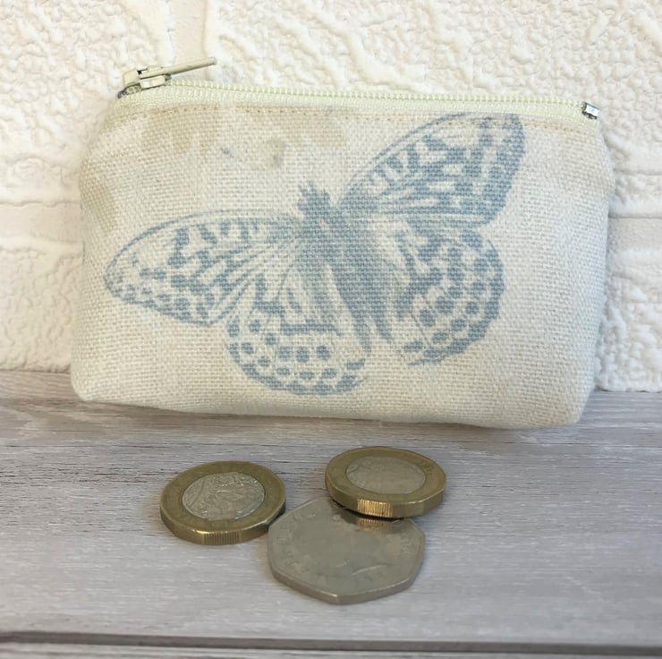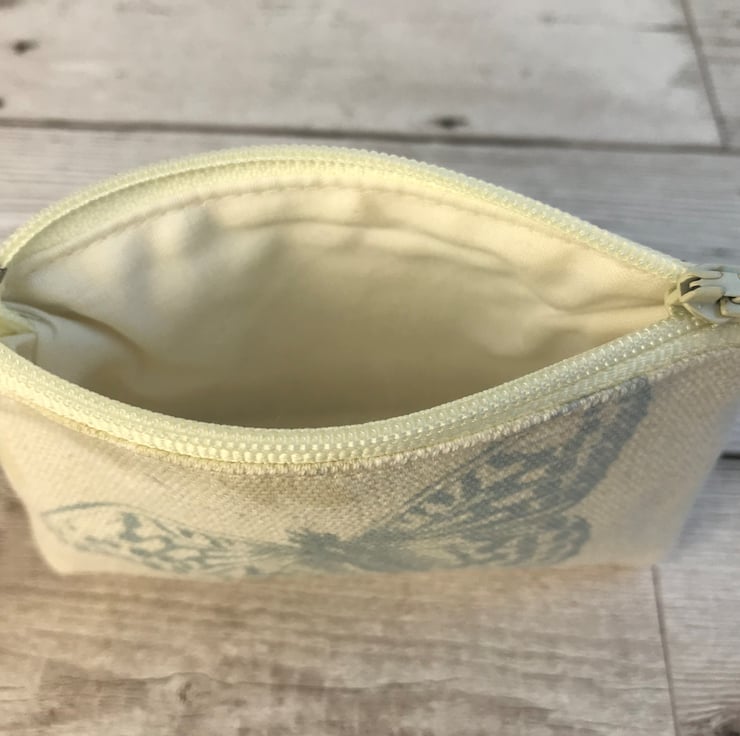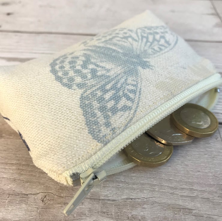 A small coin purse in pretty cream fabric with a large pale blue butterfly. The cream background has a very faint and subtle pattern of plants in a slightly darker cream. The coin purse has a cream zip and is lined with cream fabric. The base of the purse is boxed to give more space inside.