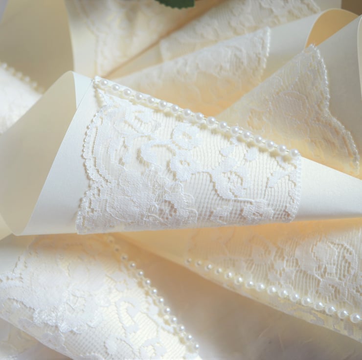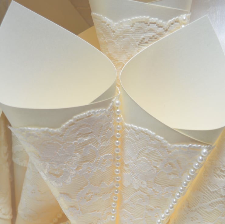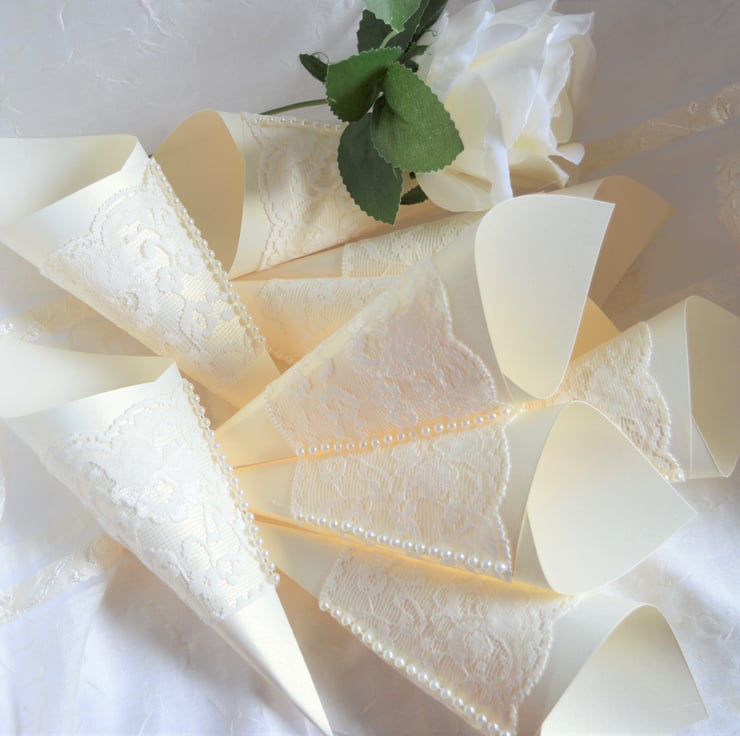 10 LUXURY IVORY PEARL CONFETTI CONES ADORNED WITH LACE & PEARLS
