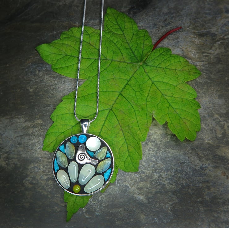 Inspired by nature. Unique glow in the dark stained glass mosaic pendant featuring a tiny silver toned bird surrounded by leaves and petals.