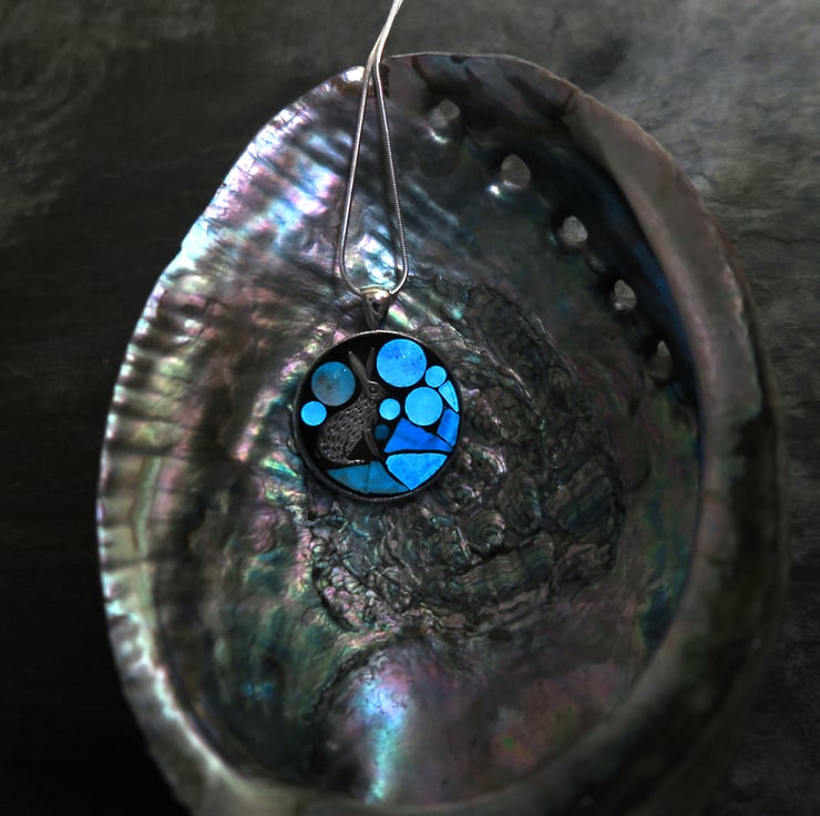 Inspired by nature. Unique glow in the dark stained glass mosaic pendant featuring a tiny silver toned hare surrounded by glowing beads.