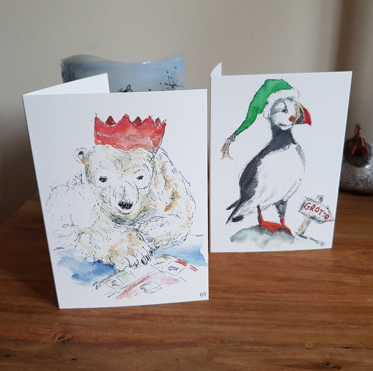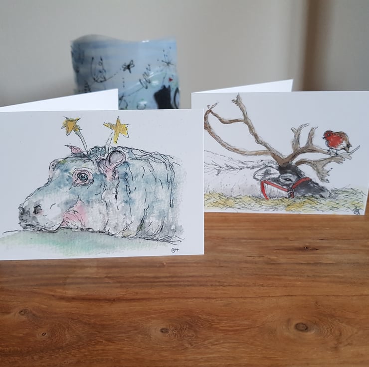 Four printed cards of original drawings of animals in festive situstions, such as playing games, wearing silly hats. Cards are blank for your message.