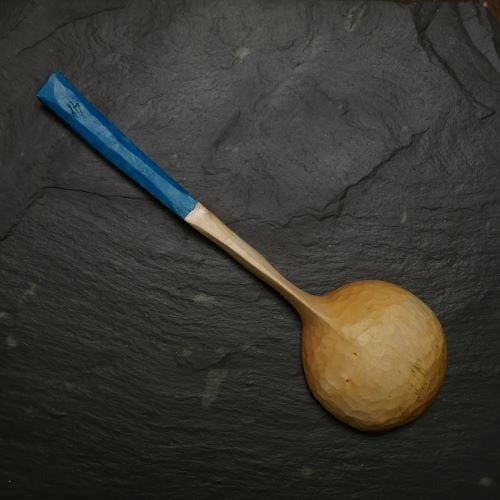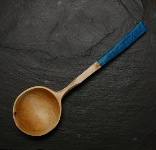 A cooking spoon handcarved in the traditional Welsh cawl spoon style but with some chipcarving and a painted handle.