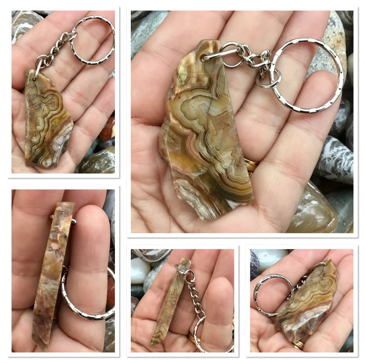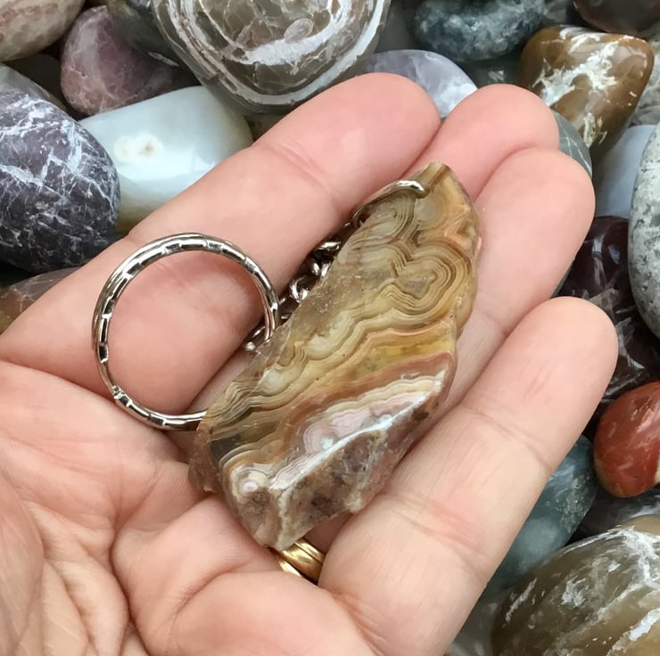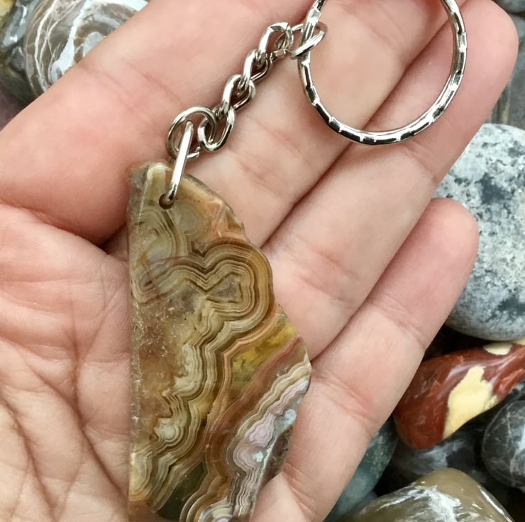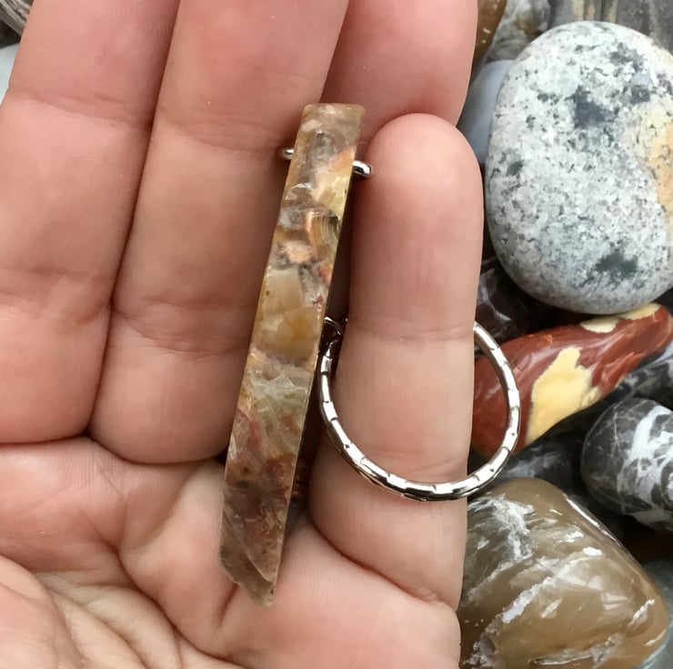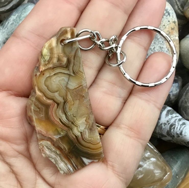 The Gemstone is a free form thick slice of banded agate, with a raggedy bottom edge and straighter side and flat front and back, gently polished all over and has been simply drilled in the centre of the top to support a silver tone triangle bail, from which the curb style keychain & 2.5mm diameter split ring have been attached.