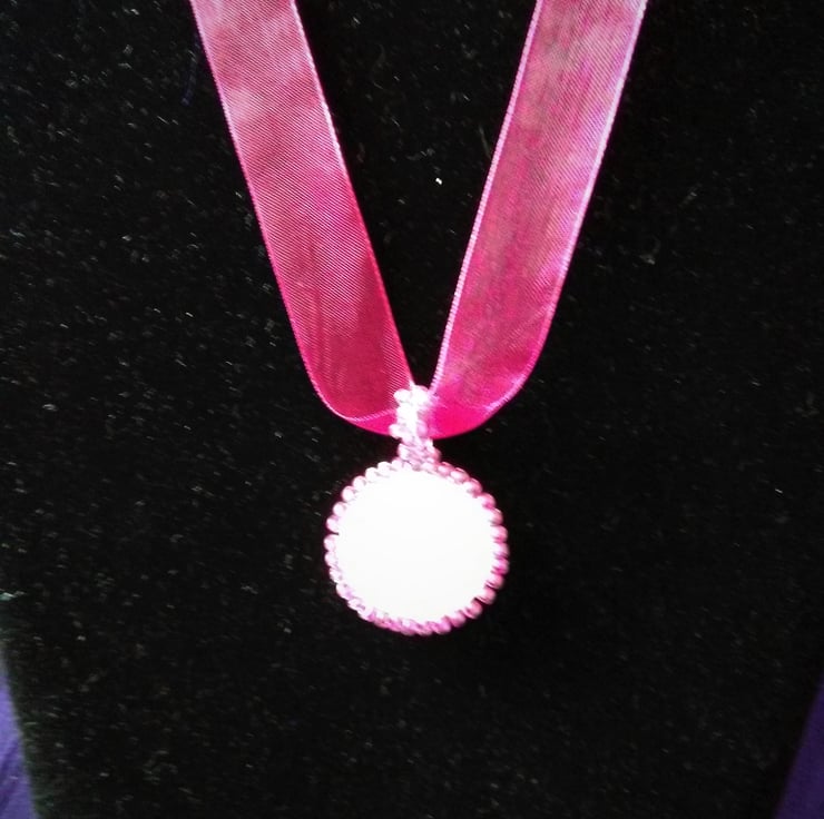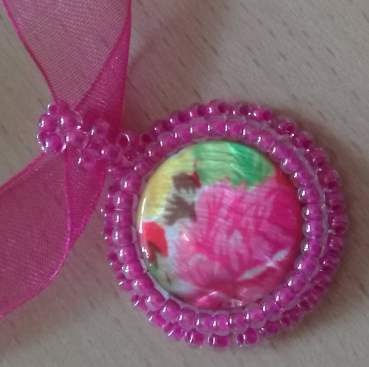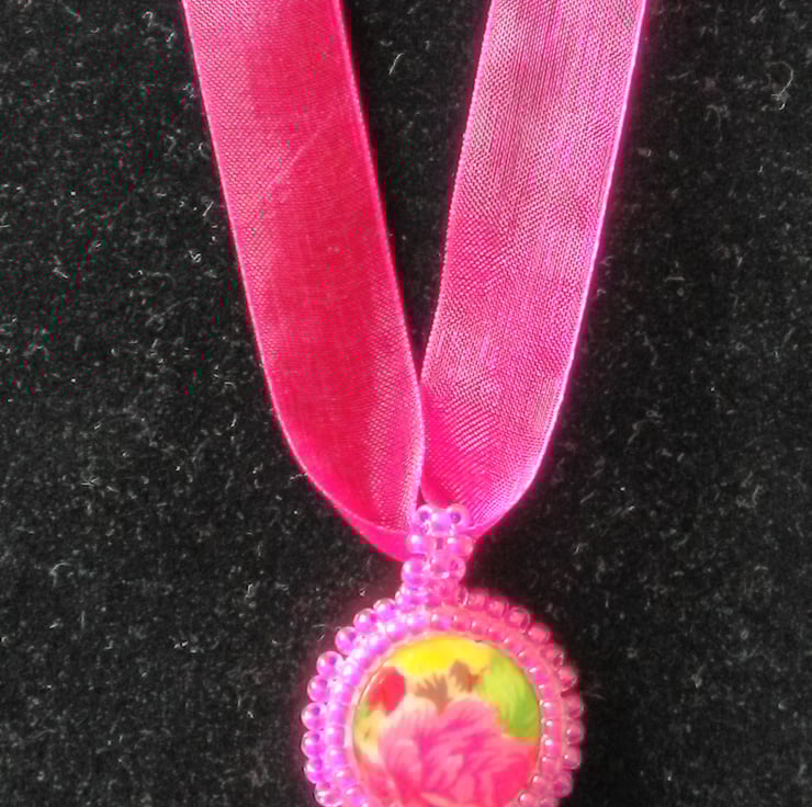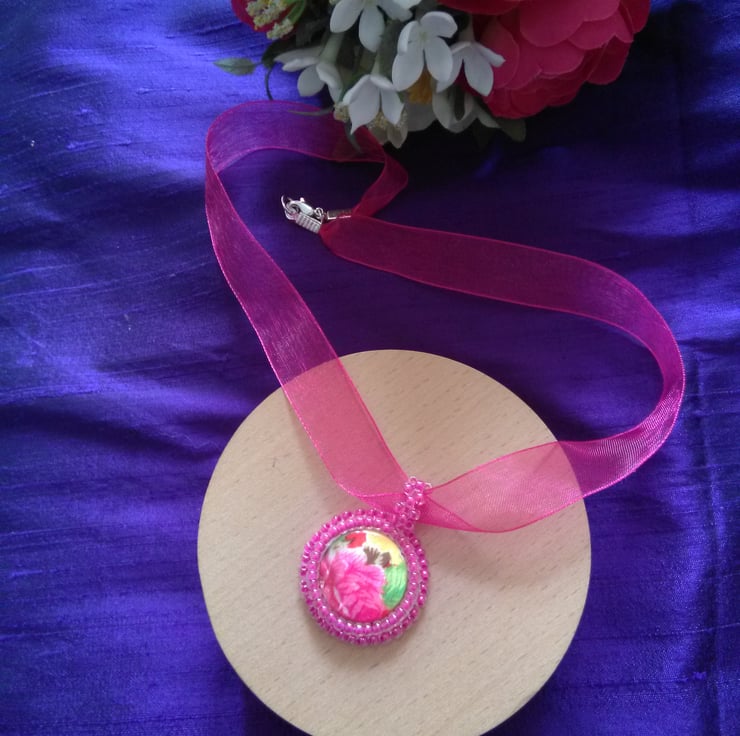 A flat floral patterned bead is surrounded by fuchsia pink miyuki seed beads with a matching bail. It is backed with cream Ultrasuede and the pendant hangs from a length of delicate pink organza ribbon. It is fastened with a silver plated lobster claw clasp. This is a really pretty and colourful piece and comfortable to wear with the soft organza ribbon.