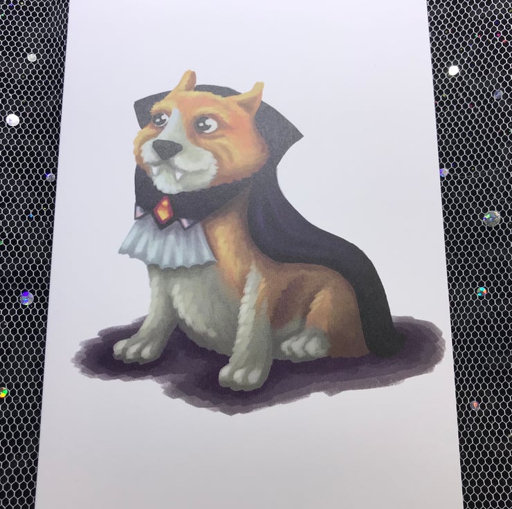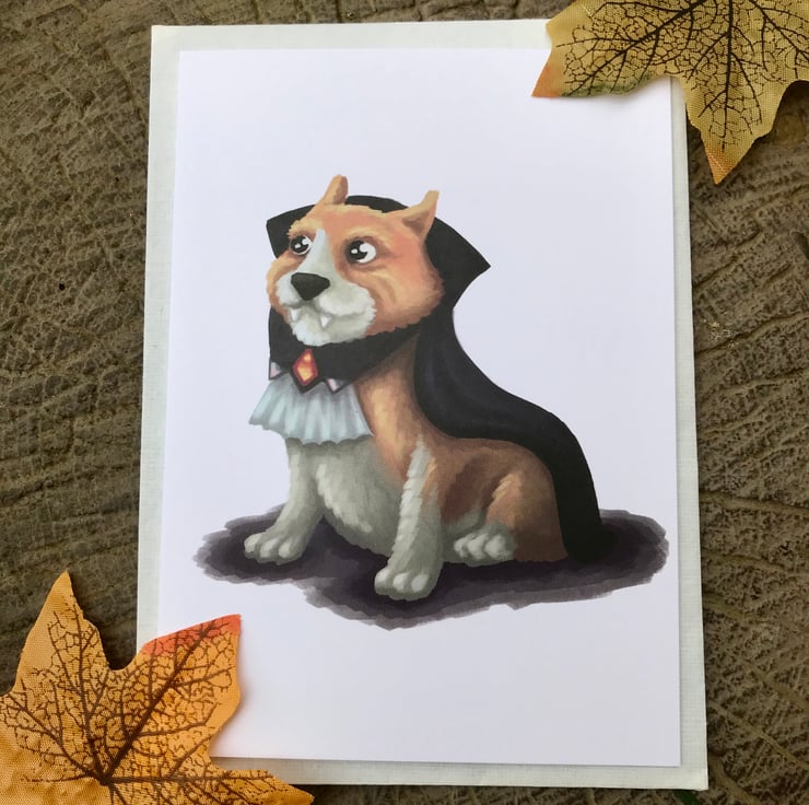 Vampire Corgi blank greeting card with white envelope by DuffleCat Prints (Damian Case)