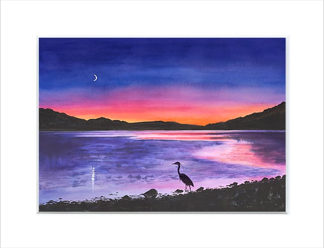 This print is reproduced by me from a scan of an original illustration created in October 2018, titled "The Watcher - New Moon at Twilight, Loch Sunart".