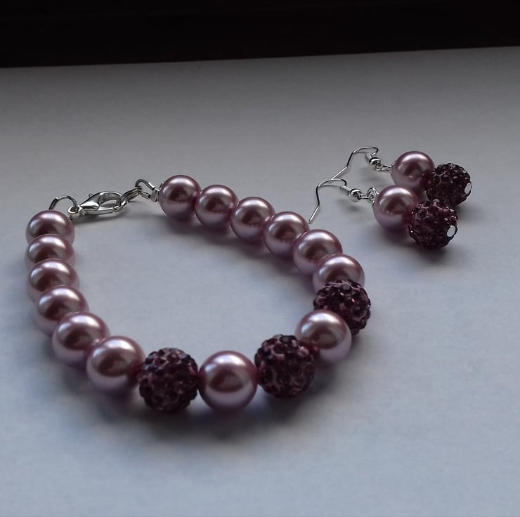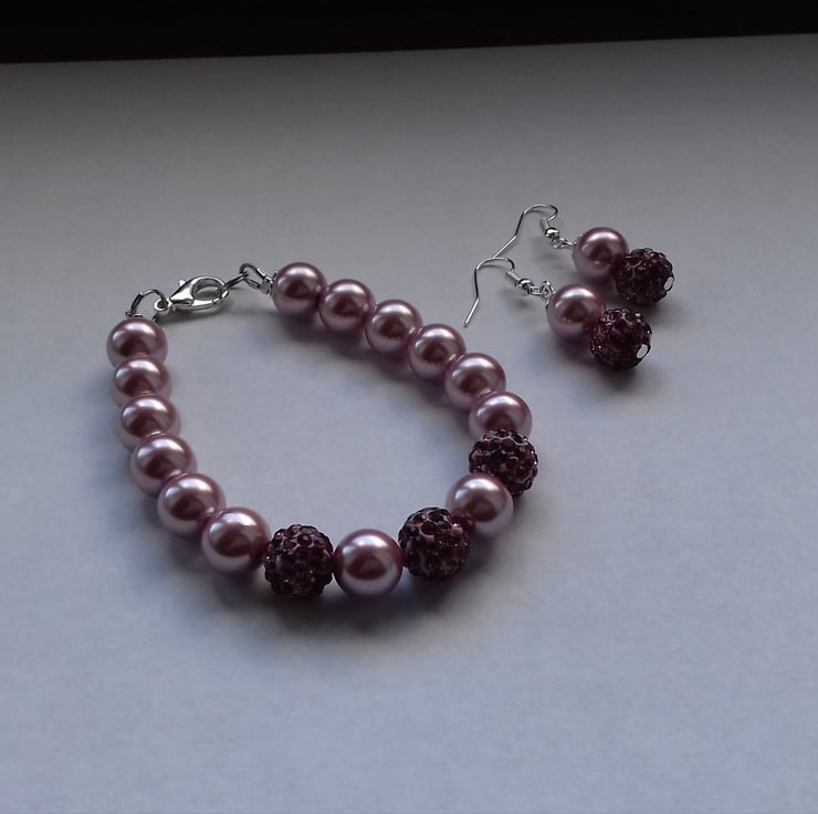 THE BRACELET AND EARRING SET HAVE BEEN MADE USING 10MM GLASS MAUVE PEARL BEADS, 10MM MAUVE RHINESTONE PAVE BEADS ALONG WITH SILVER PLATED FLOWER BEAD CAPS. THE BRACELET HAS BEEN FINISHED WITH SILVER PLATED LOBSTER CLASP AND THE EARRINGS FINISHED WITH SILVER PLATED KNICKLE FREE FISH HOOK EAR WIRES.
