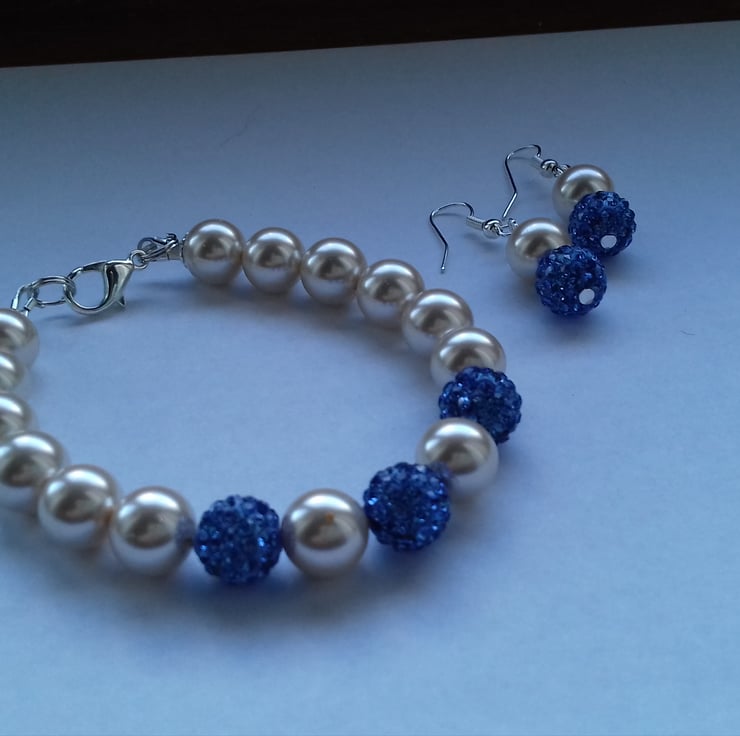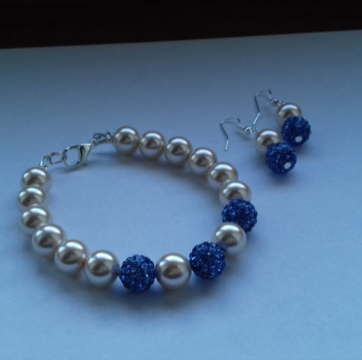 THE BRACELET AND EARRING SET HAVE BEEN MADE USING 10MM GLASS CHAMPAGNE COLOURED PEARL BEADS, 10MM BLUE RHINESTONE PAVE BEADS ALONG WITH SILVER PLATED FLOWER BEAD CAPS. THE BRACELET HAS BEEN FINISHED WITH SILVER PLATED LOBSTER CLASP AND THE EARRINGS FINISHED WITH SILVER PLATED KNICKLE FREE FISH HOOK EAR WIRES.