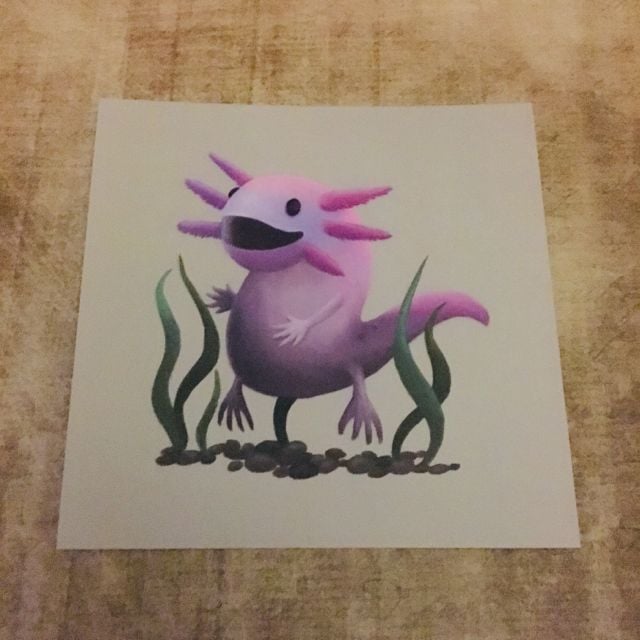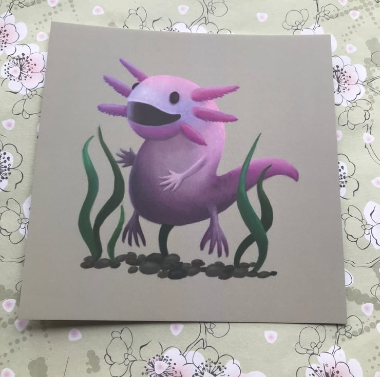 Axolotl square post card by DuffleCat Prints (Damian Case). Front of card with design on is matt coated. Back of card is blank and uncoated for your message. Postcard is 120mm x 120mm, 330gsm card stock.