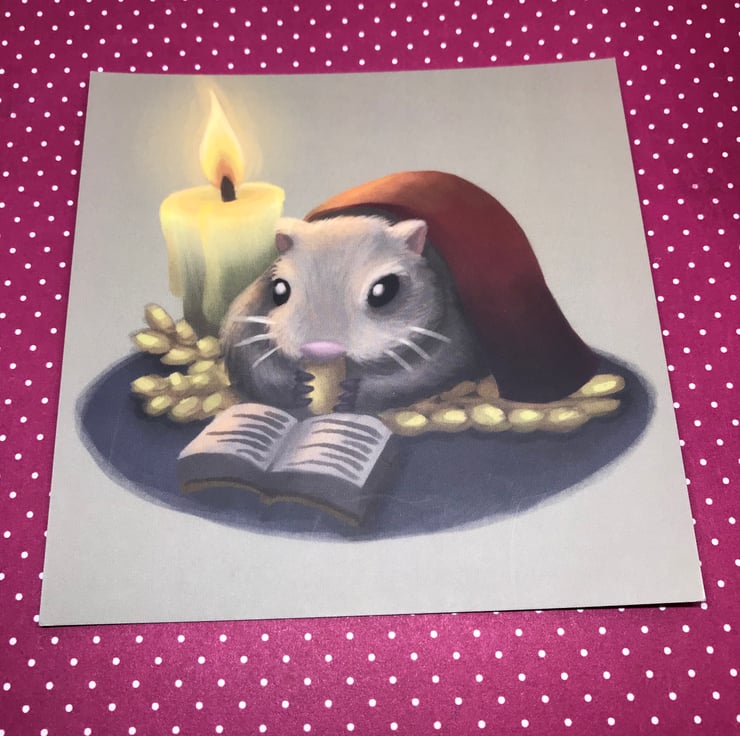 Winter Mouse square post card by DuffleCat Prints (Damian Case). Front of card with design on is matt coated. Back of card is blank and uncoated for your message. Postcard is 120mm x 120mm, 330gsm card stock. Portrait.
