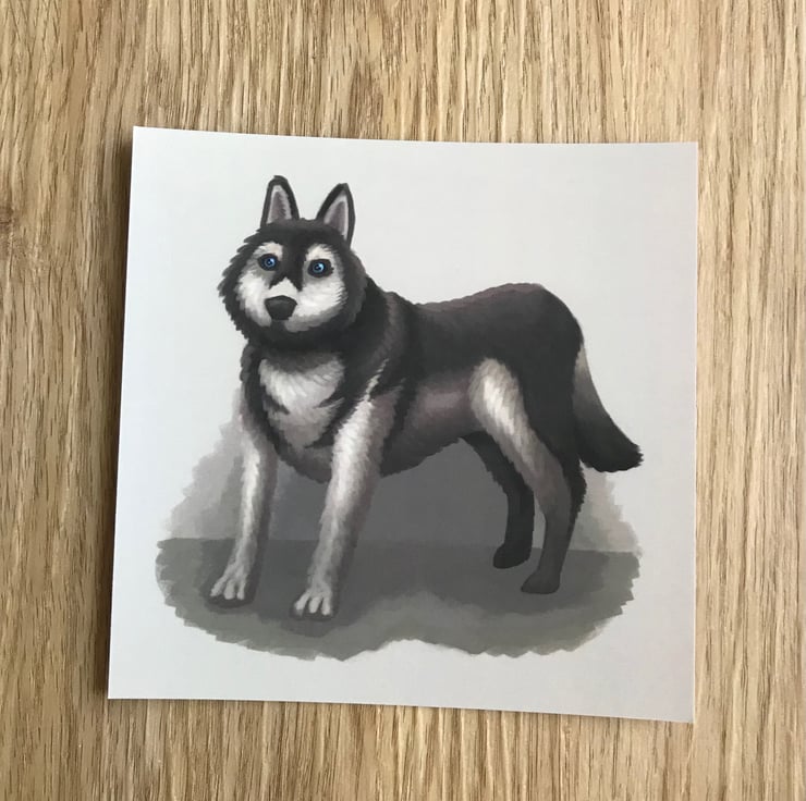 Husky square post card by DuffleCat Prints (Damian Case). Front of card with design on is matt coated. Back of card is blank and uncoated for your message. Postcard is 120mm x 120mm, 330gsm card stock.