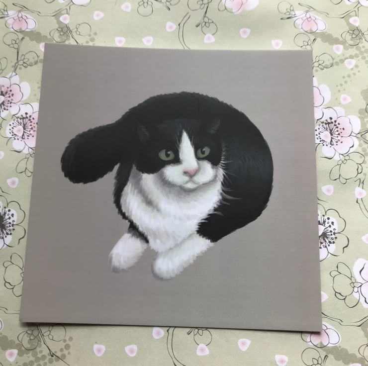 Black and White Cat square post card by DuffleCat Prints (Damian Case). Front of card with design on is matt coated. Back of card is blank and uncoated for your message. Postcard is 120mm x 120mm, 330gsm card stock.