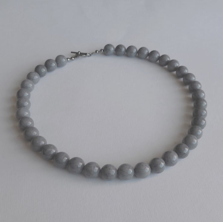 This chunky grey necklace has been created using dyed jade beads and can be used to add a pop of grey to an everyday look or to add that finishing touch to an outfit for a special occasion. The jade beads have a lovely grey and black flecked finish.