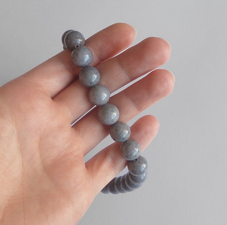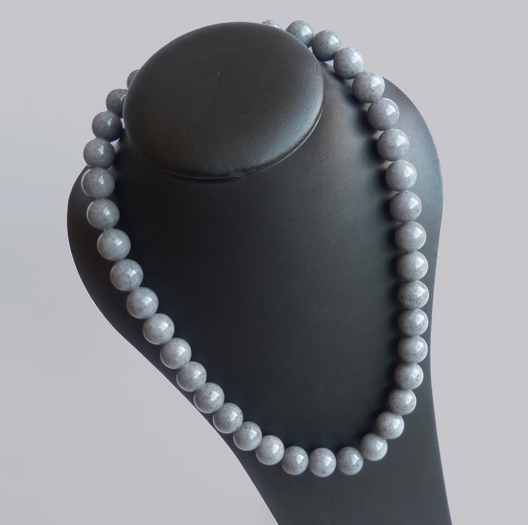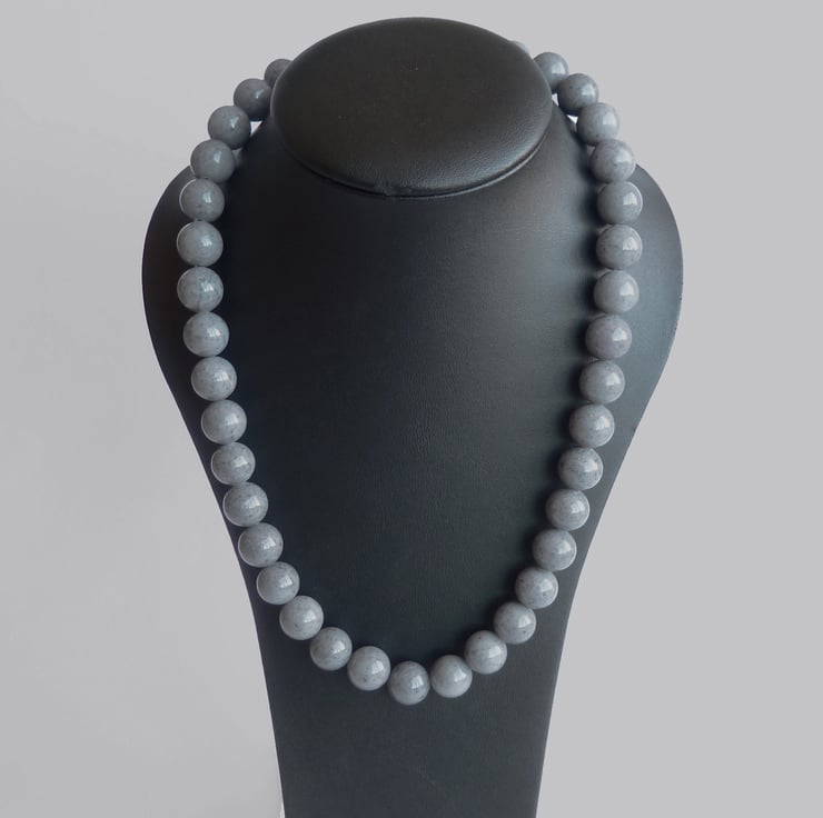 Each grey jade bead is 12mm in diameter. This necklace is finished with a gunmetal plated toggle clasp and measures 19 inches / 48.25cm in length.