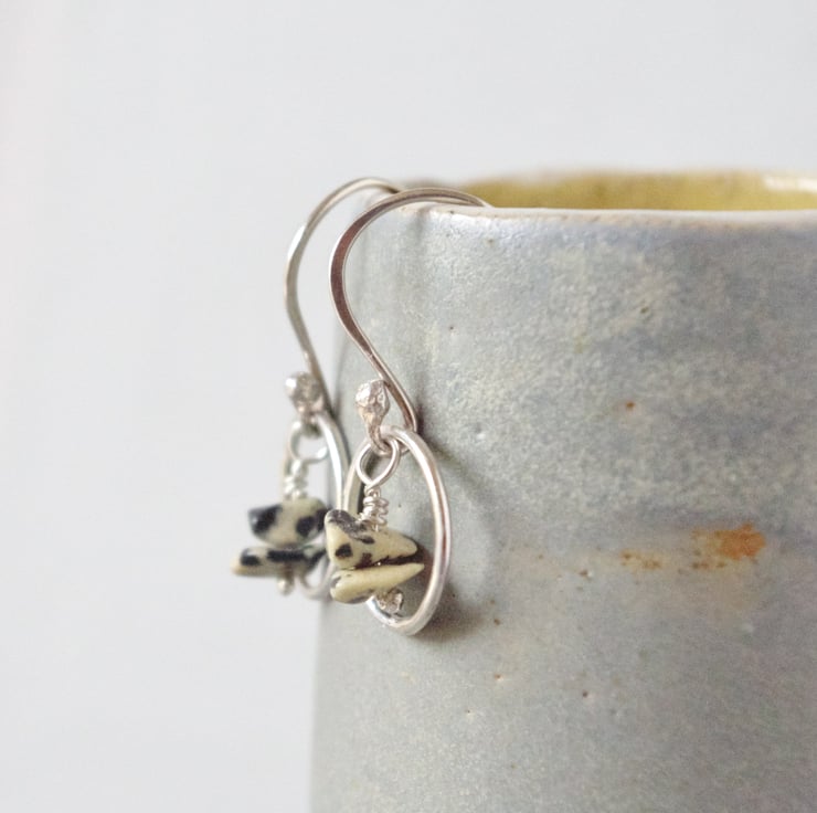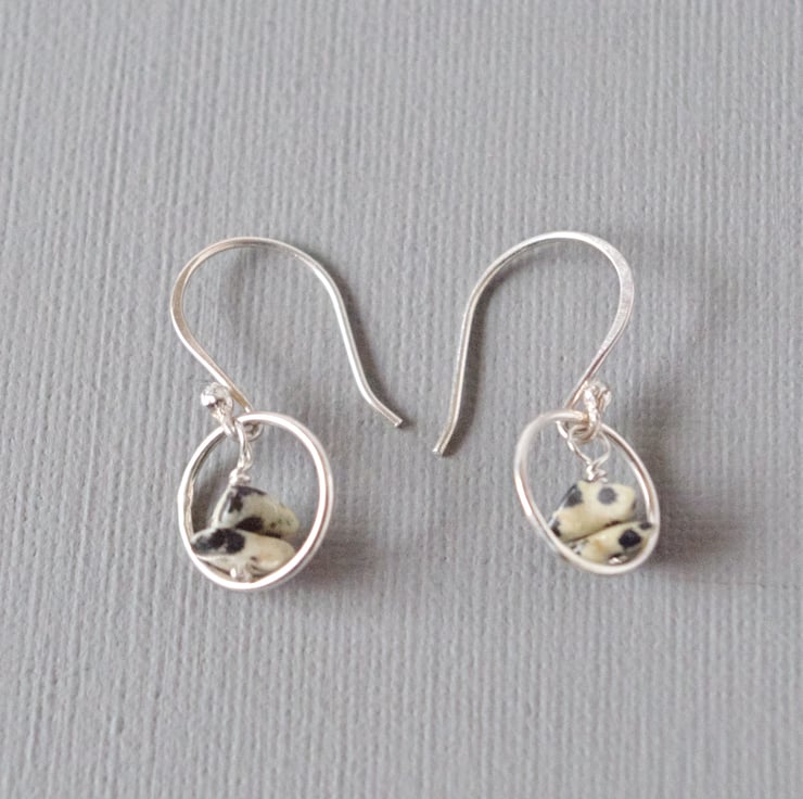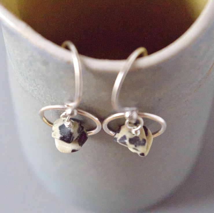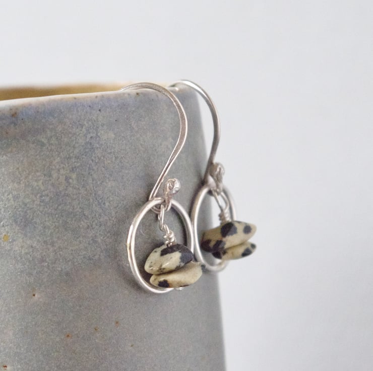 These minimalist sterling silver hoop karma earrings are designed with simplicity in mind. Each hoop is a perfect circle, symbolizing the principle of karma. Two naturally spotted Dalmatian Jasper stones are suspended inside. All of the parts of these earrings have been handmade by me using sterling silver wire to which I have given a shiny mirror finish. Dalmatian Jasper is an opaque semi-precious gemstone, coloured light cream with naturally occurring spots in ebony, russet and black, very similar to the markings of a Dalmatian dog or Appaloosa horse. These particular stones have been reclaimed from a vintage necklace to produce a one of a kind ethical pair of earrings and I have ensured that each stone is in perfect condition before using it. Each earring measures just 28 mm or 1 and 1/16" long including the ear-wire and is so light and easy to wear. The third photograph shows the earrings next to a 3" vintage lipstick case to show a sense of scale.