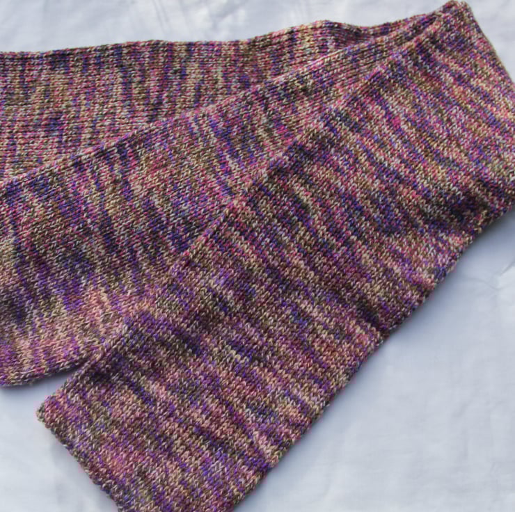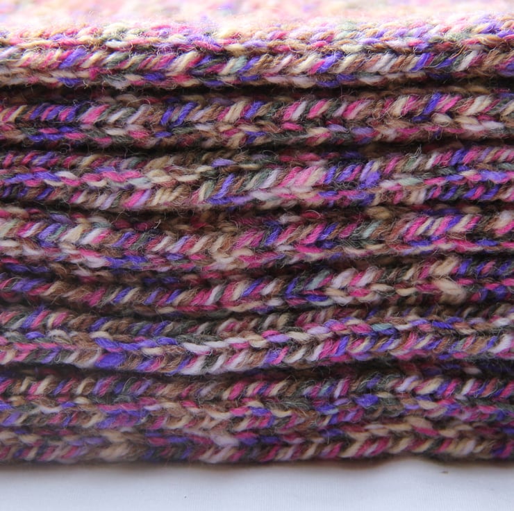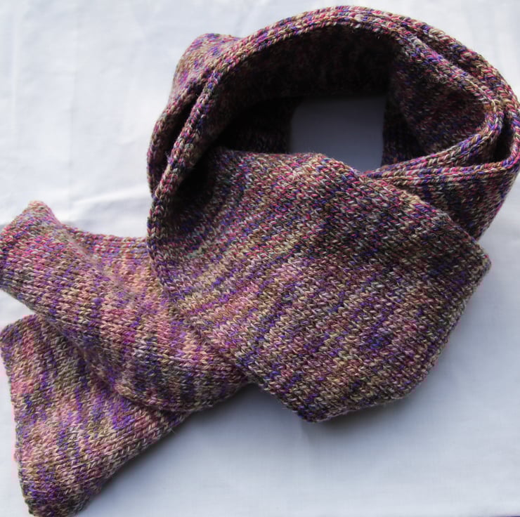 A beautifully unique, soft, stretchy, double sided scarf knitted in acrylic / wool mix random dyed yarn in lovely heather shades.