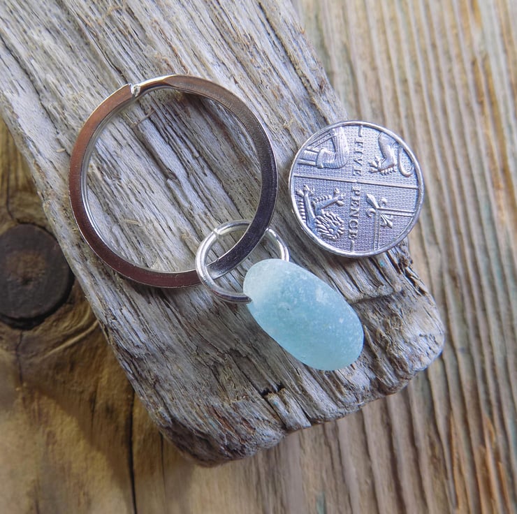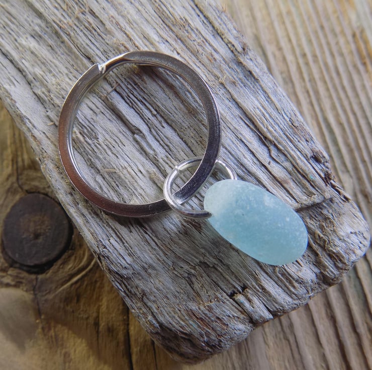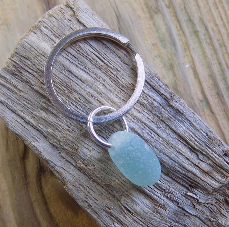 A bubble type piece of sea glass drilled and added to a keyring with a very thick strong jump ring.