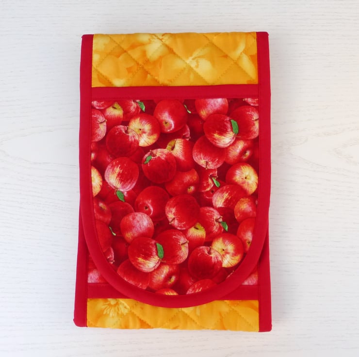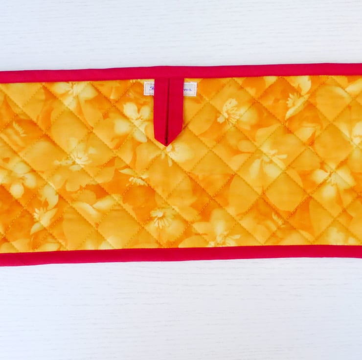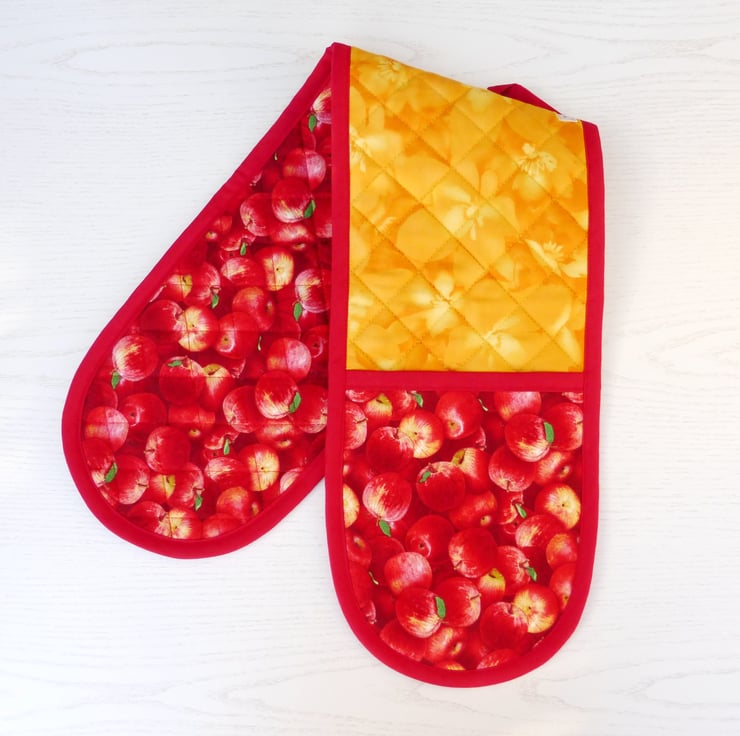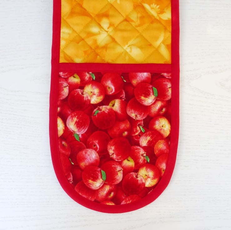 These oven gloves have been made using a lovely quilting cotton fabric of mainly red apples with a few yellow highlights. The contrasting fabric is a orange/yellow patterned fabric, also 100% cotton .