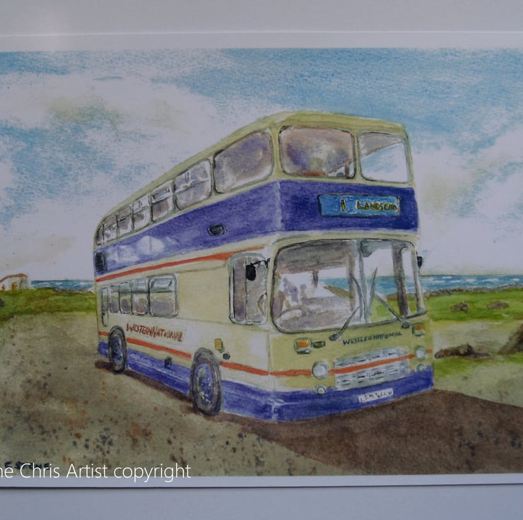 A professionally produced print from my original watercolour of a classic Bristol VRT series 3 bus, in Western National 1990's colours, at Lands End in Cornwall.