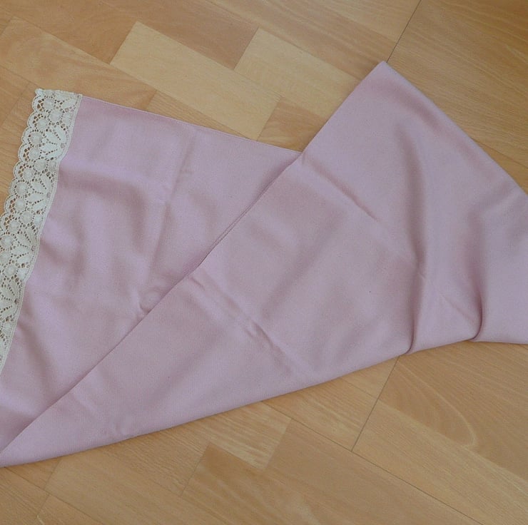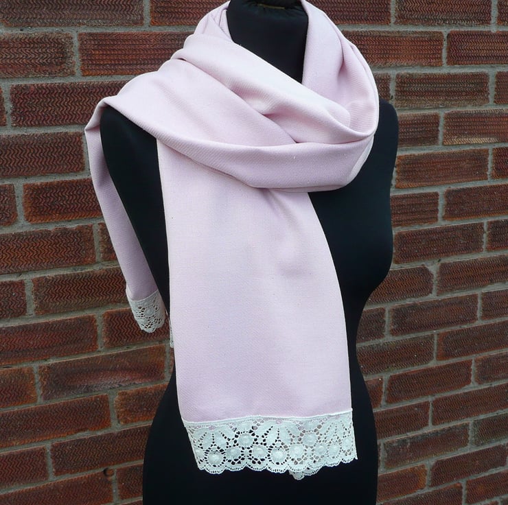 Ladies scarf is made from Kingcraig fabrics wool twill in pale pink and trimmed with cream Nottingham lace along the short edges. The twill fabric is from the Scottish highlands and the lace is from the local Nottingham lace factory right here in the midlands.