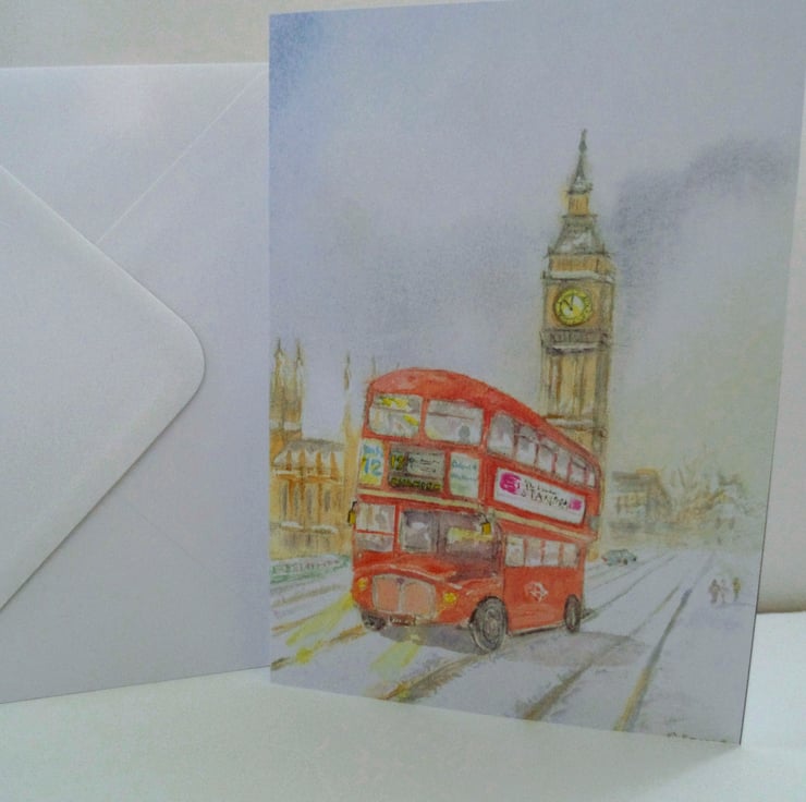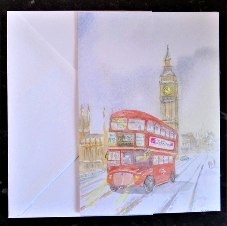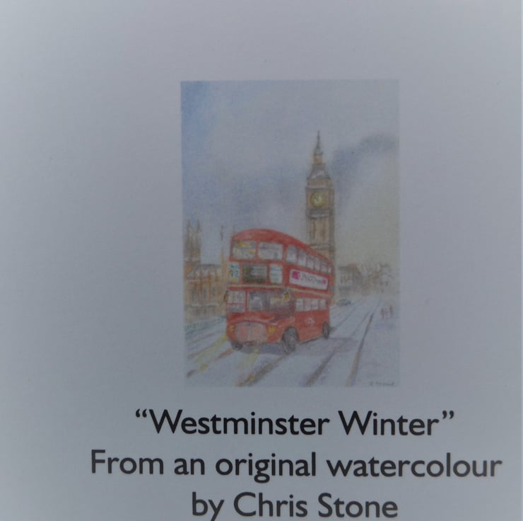 A professionally produced blank greetings card from my original watercolour "Westminster Winter" of a classic Routemaster RM London bus. I have placed it in a wintry scene on Westminster Bridge, with Big Ben and the Houses of Parliament in the background.