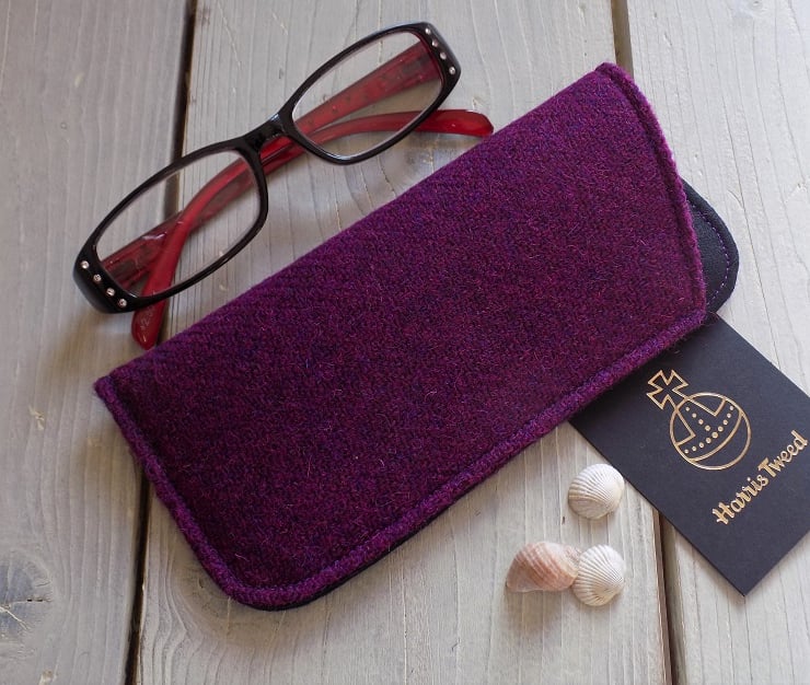 Generously proportioned Harris Tweed glasses case: deep violet purple plain weave.