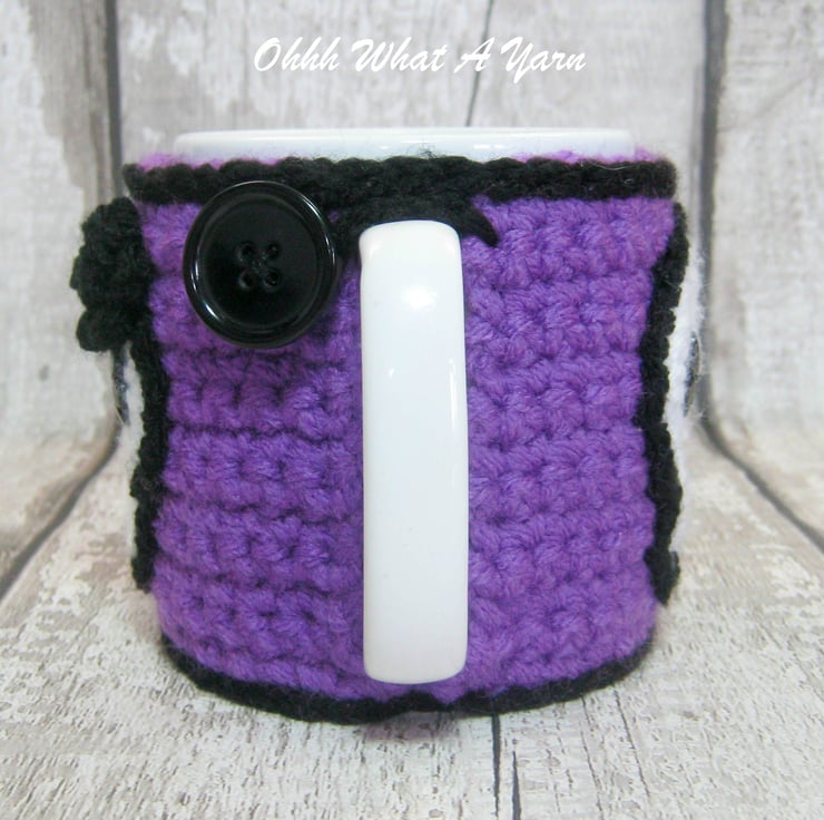 This spooky purple sugar skull mug hug is crocheted using 100% acrylic yarns.