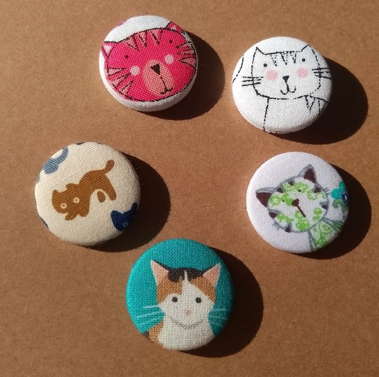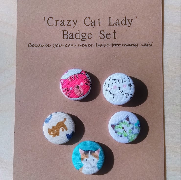 Just what the crazy cat lady in your life (or you!) needs! After all you can never have too many cats! This badge set consists of 5 different fabric covered cat badges and would make a perfect gift or stocking filler. The badges are an inch (2.54 cm) diameter and look great on coats, bags, hats, scarfs, jumpers etc. Group them together or wear them one at a time. Or maybe you want to split them up and use them for gifts for more than one cat fan. The back has a metal pin fastening.